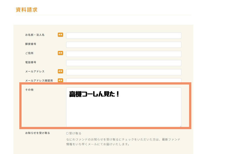 正直あんまりあってもなくてもどうってことはないと思いますが、欲しいぜ!って方がいれば、資料請求の際、「その他」の項目へ「たかつー見た」と記載してみてくださいね。