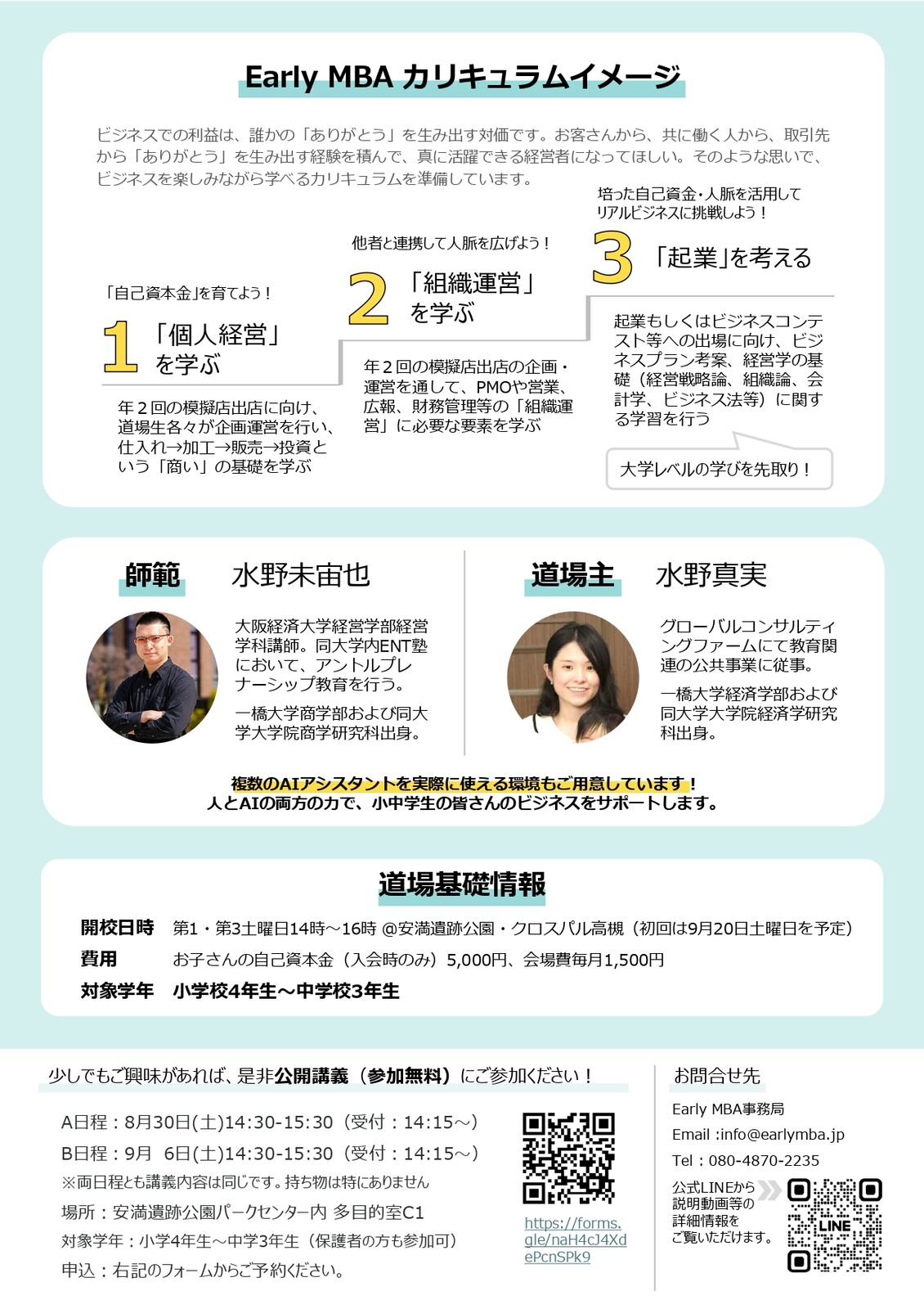 「雇用される力」よりも「経営力」が求められる時代に備えて、本格的に・継続的に・段階的にビジネスを学べる場を作りたい。そんな思いで、10歳からの体験型経営道場「Early MBA」を開講します。