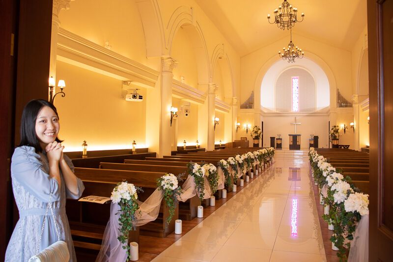 中に入ると、9mの大天井と関西最大級の20mのバージンロードがお出迎え。