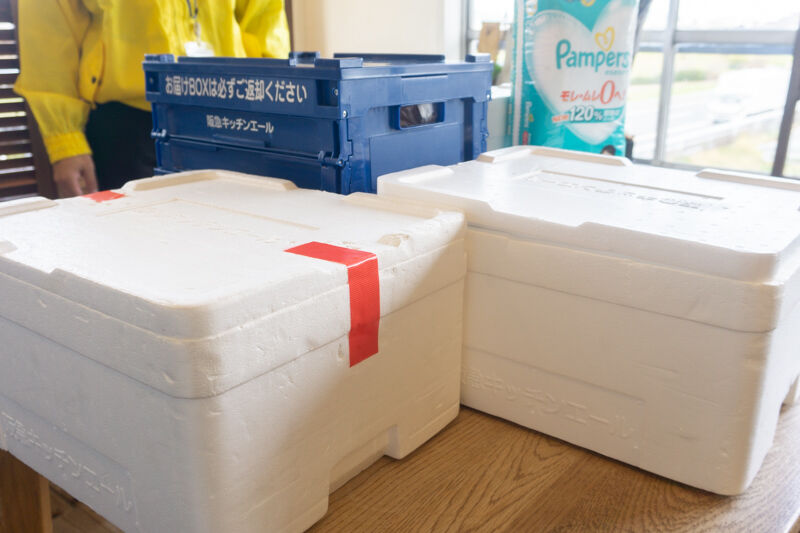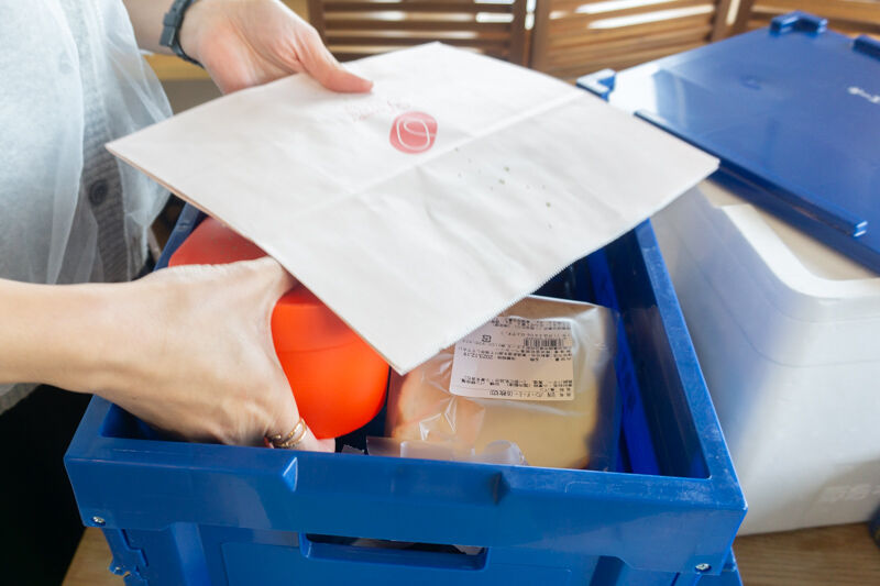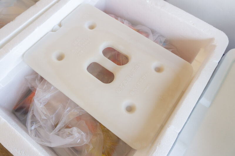 箱に青いシールが貼られていて、中には青色の蓄冷剤が入っています。