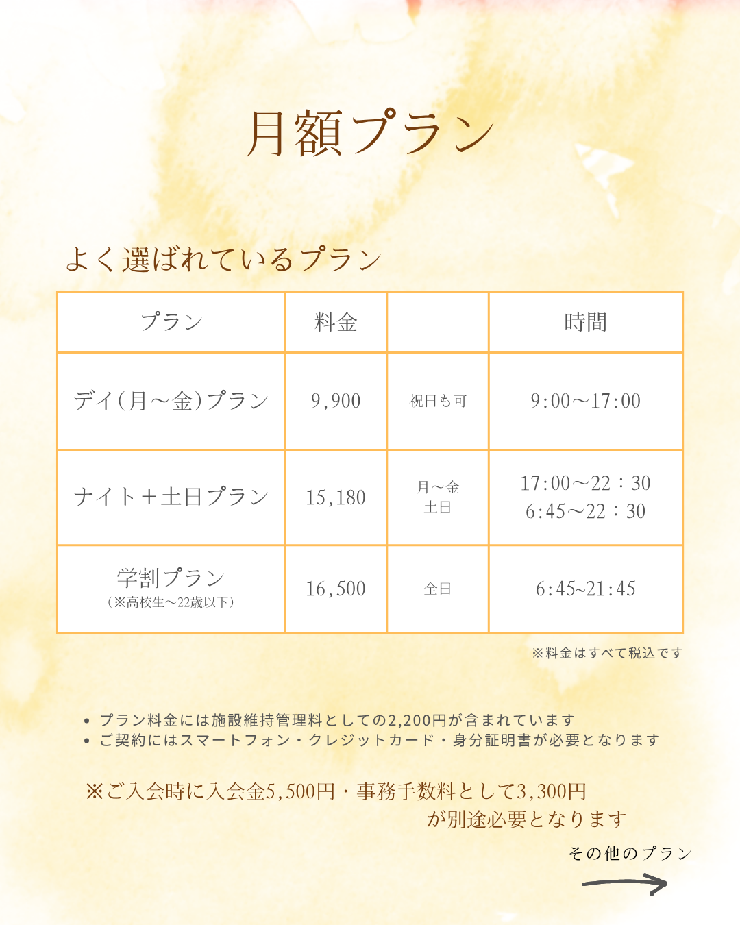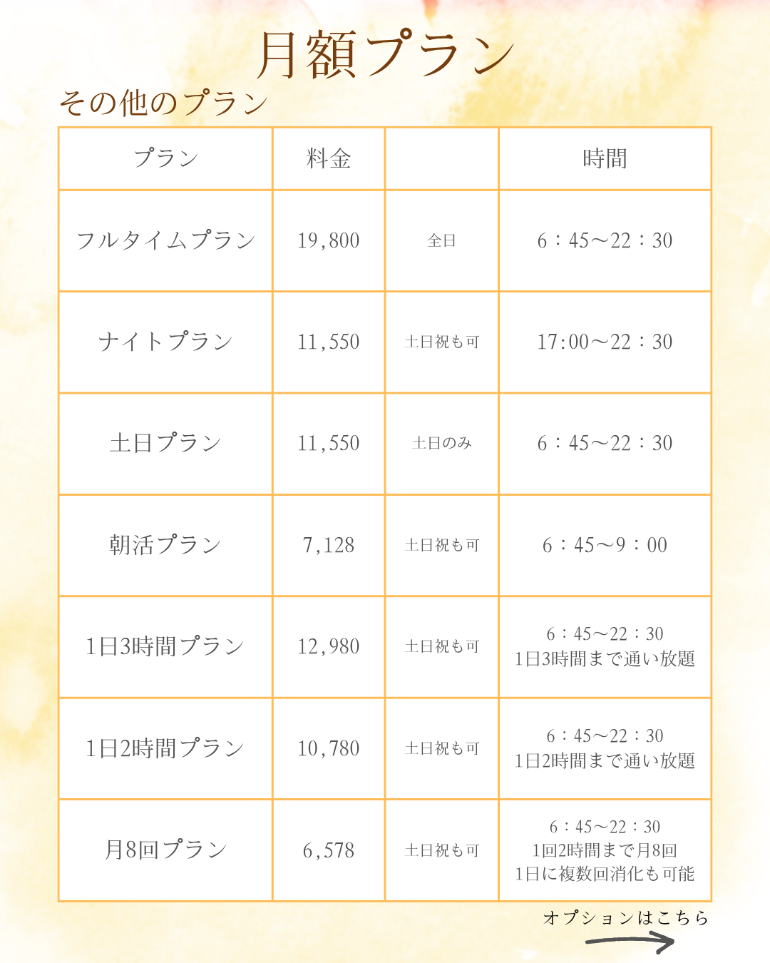 なし(GW・お盆・年末年始・臨時休業あり)料金表