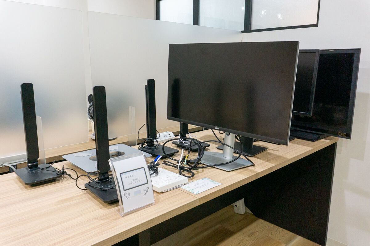 光の加減など個人の好みにも対応できるよう、デスクライトやモニターなどの無料貸し出し備品も用意しています」