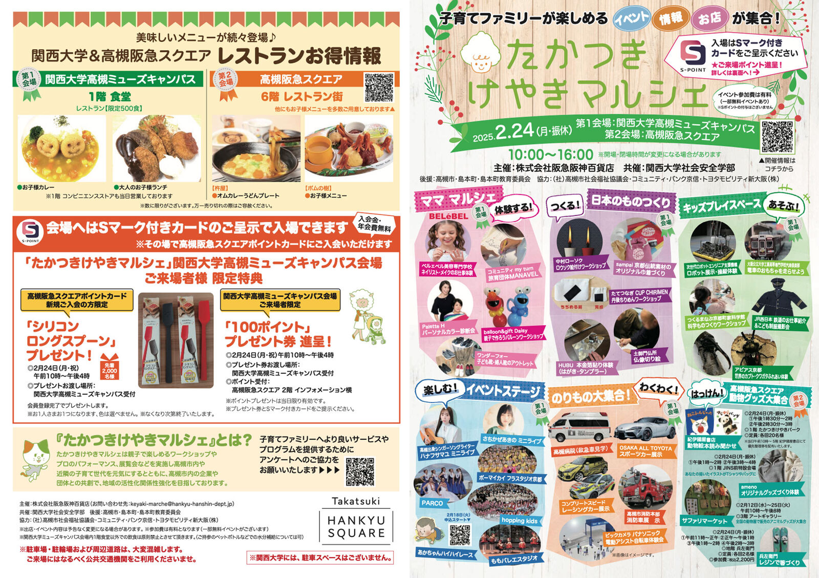 「たかつきけやきマルシェ」は、株式会社阪急阪神百貨店が主催、関西大学社会安全学部が共催の子育てファミリーが楽しめるイベント。