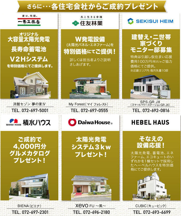 「さらにさらに、ハウスメーカーによってそれぞれのご成約プレゼントも用意されてるんやって!すげ〜太っ腹〜!!