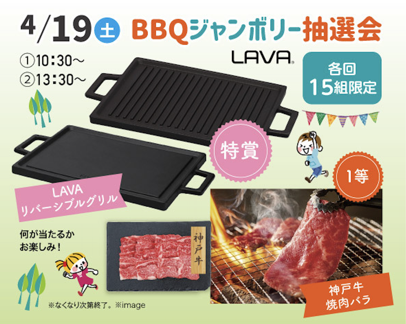 特賞はLAVAのリバーシブルグリル、1等は神戸牛の焼肉バラが当たるんやって!めっちゃ太っ腹!」