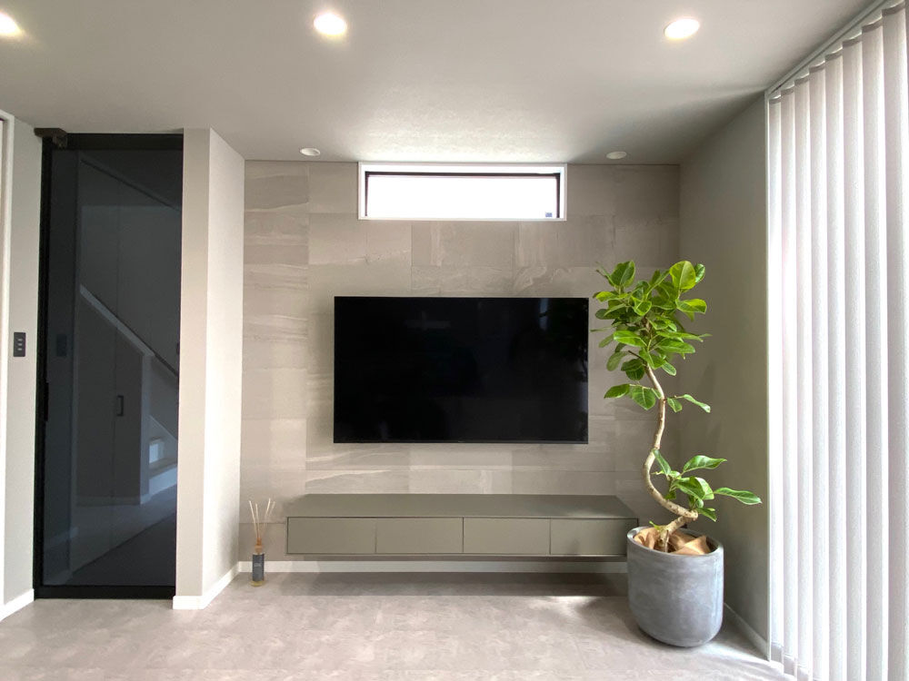 置き型のテレビよりも50cmほど壁側に下がっているだけで、部屋がかなり広く見えるんです。