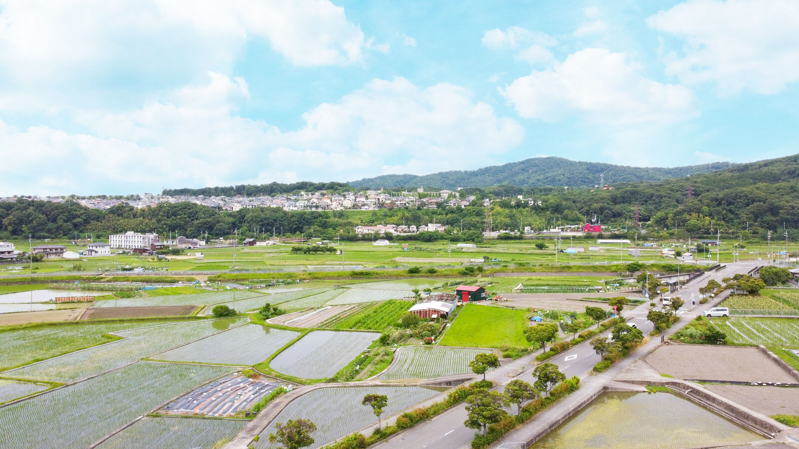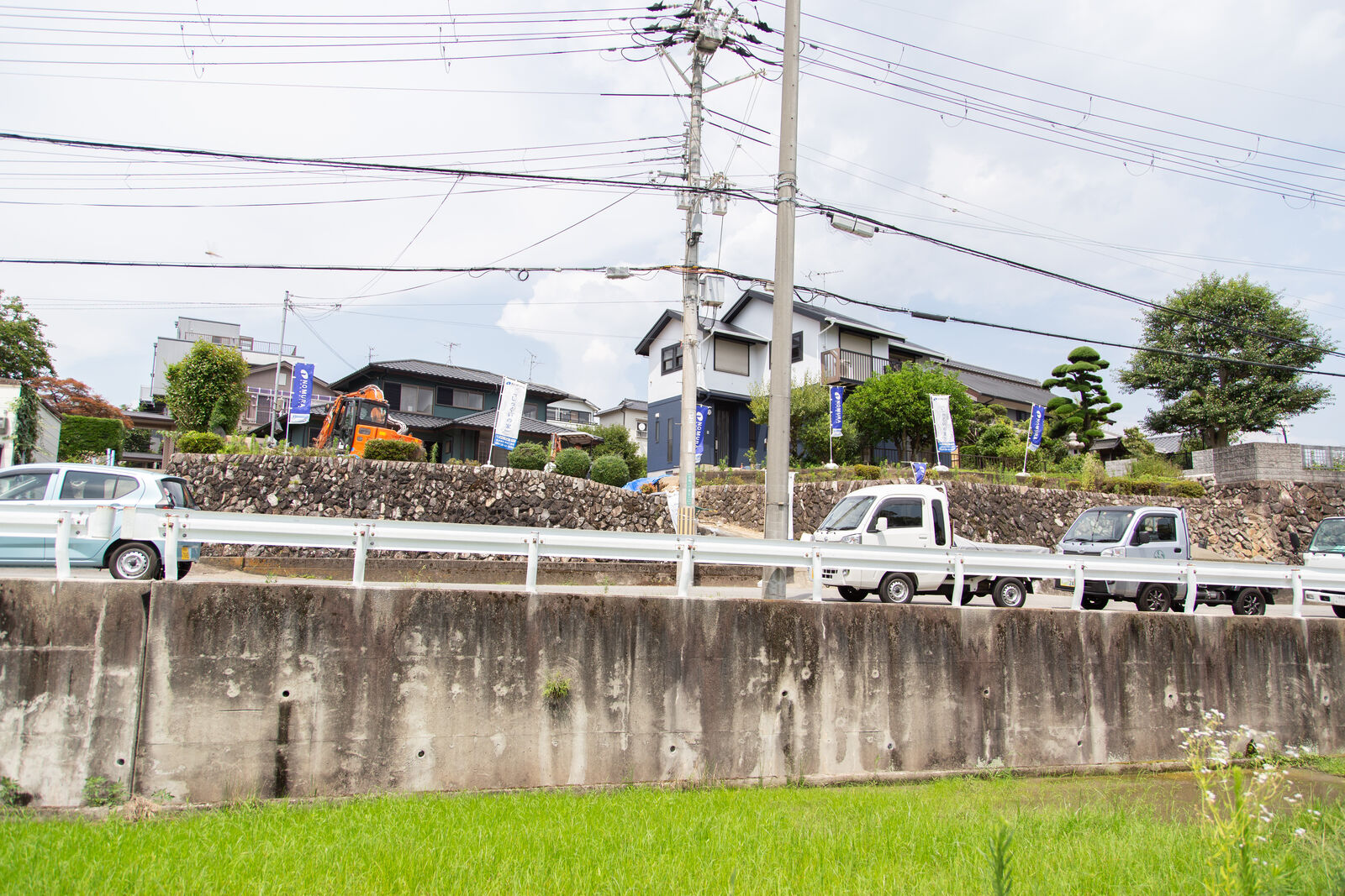 こちらの分譲地は、メイン道路から田んぼを挟んで一段上の道路に面し、さらにその一段高くなった所に建つ南向きの住まい。