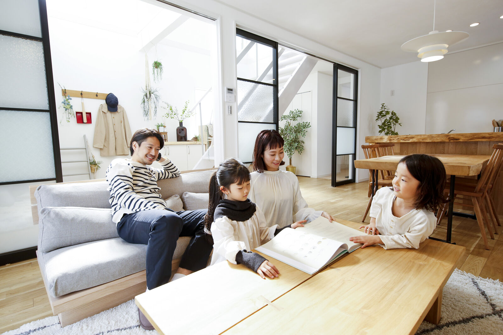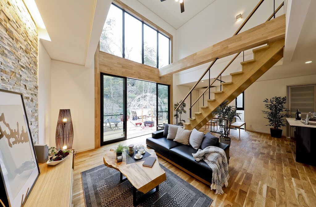 ひろびろ開放感のあるリビングで家族でまったり…玄関の吹き抜けから明るい光も入るからめっちゃ心地よさそう