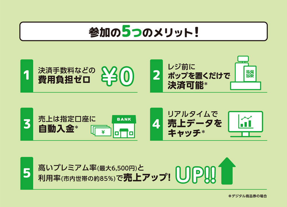 その他、このあと紹介するデジタル商品券の場合、売上はリアルタイムでスマホやパソコンで確認できたり、売上は指定口座に自動入金されるのでお金の流れがスムーズだったり…メリットがたくさんあります!」