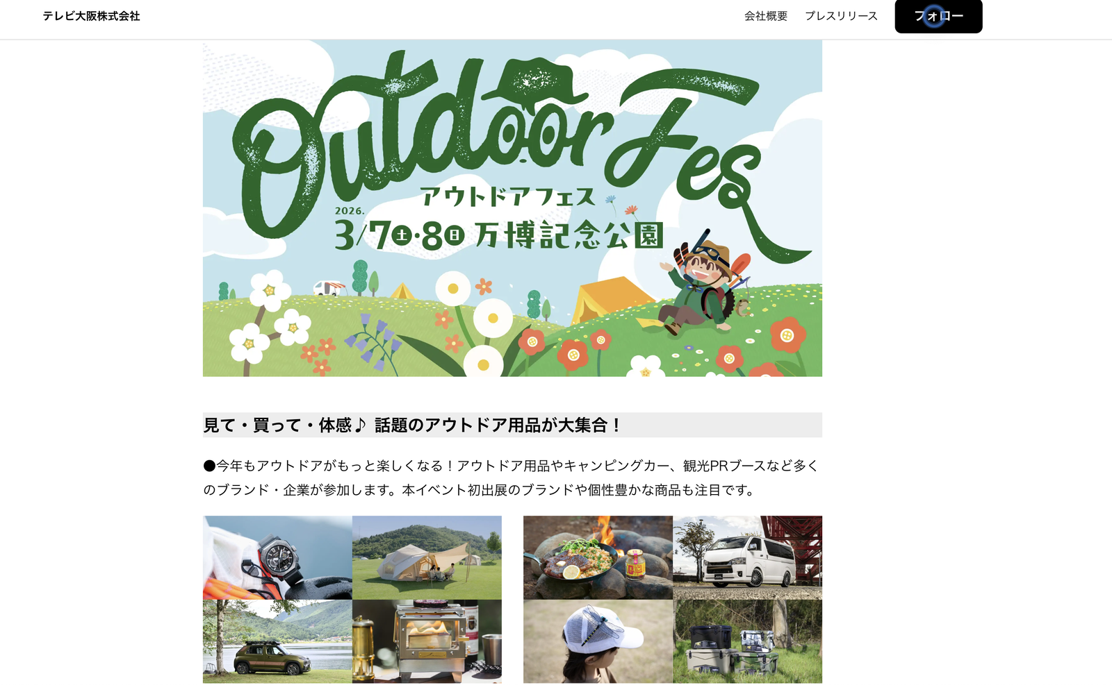 リリースによると、3月7日と8日の2日間に大阪・万博記念公園の広い芝生エリアで「アウトドアフェス2026」が開かれるようです。