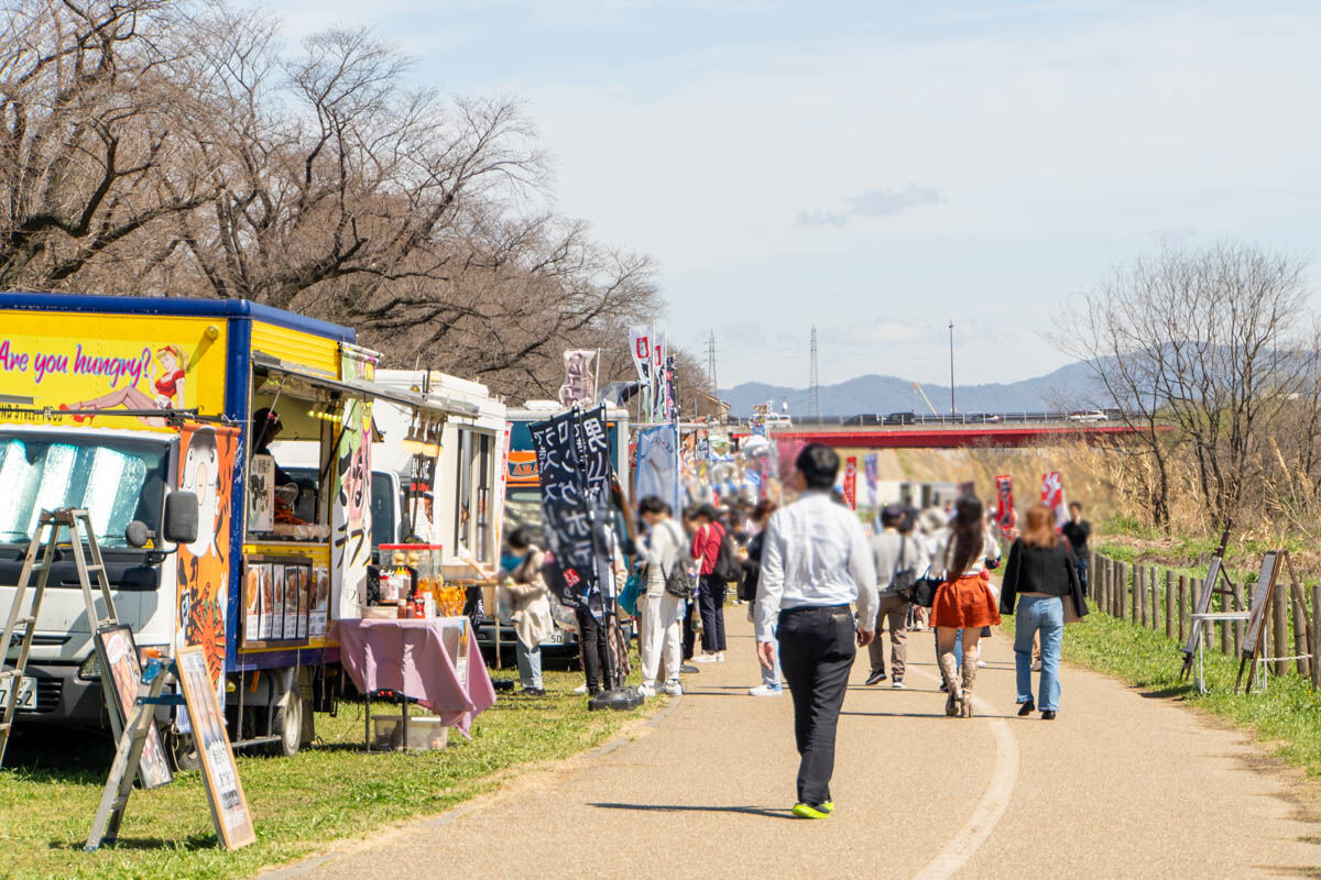 桜は咲いていなくても「背割堤さくらまつり2024」は開催しているので、屋台がズラリ。