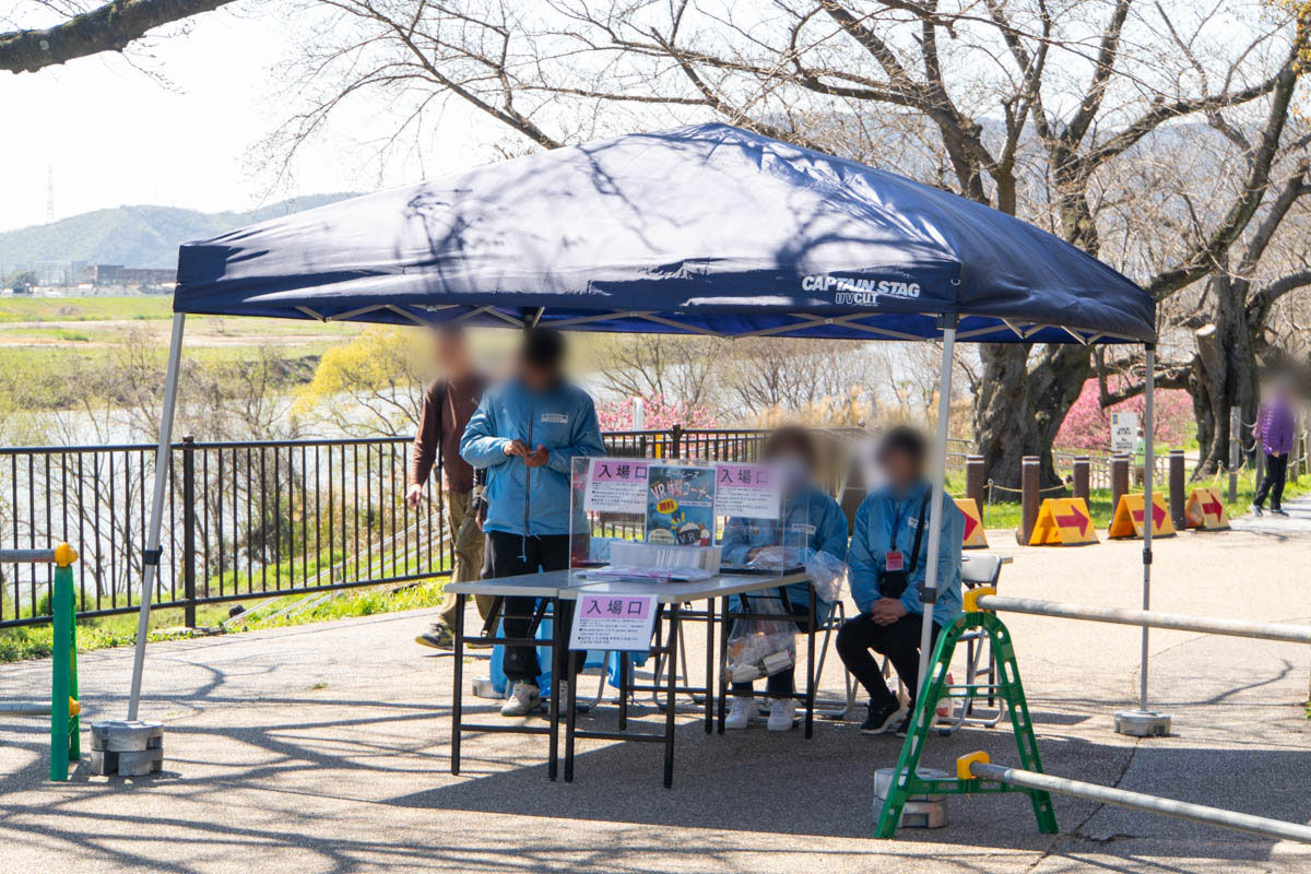 「背割堤さくらまつり」は100円の運営協力金が必要です。100円玉がない場合は入口手前のテントで両替をしてくれますよ。