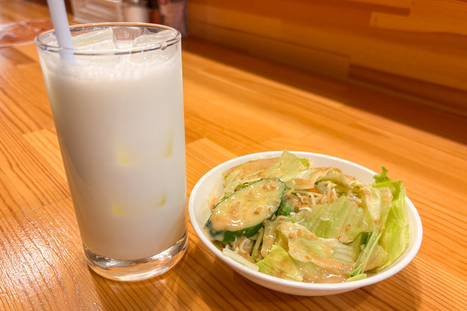 まずやってきたのは、ラッシーとサラダ。