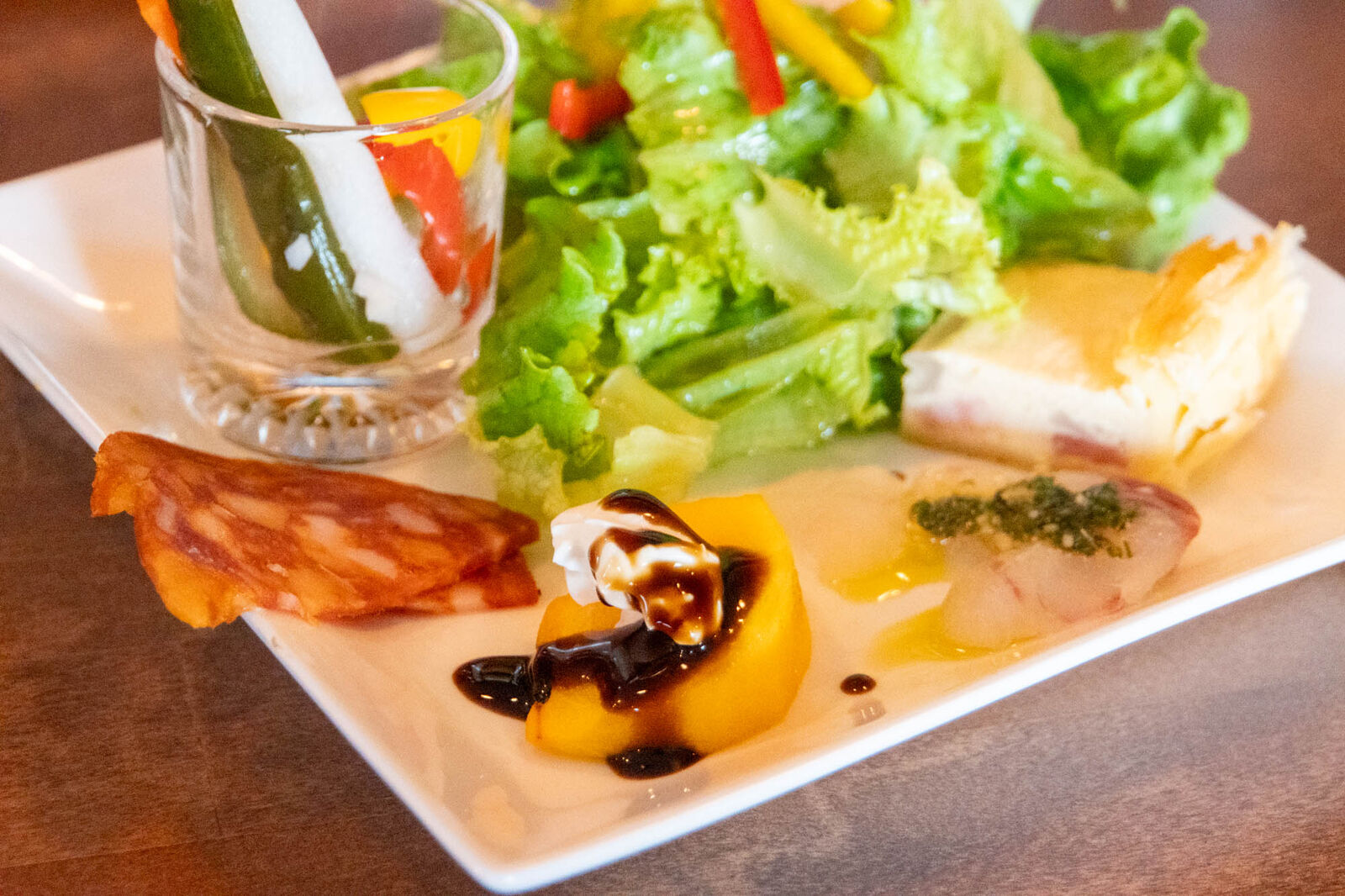 前菜には、ピクルス、サラミ、キッシュ、鮮魚のカルパッチョ、柿とクリームチーズがありました。