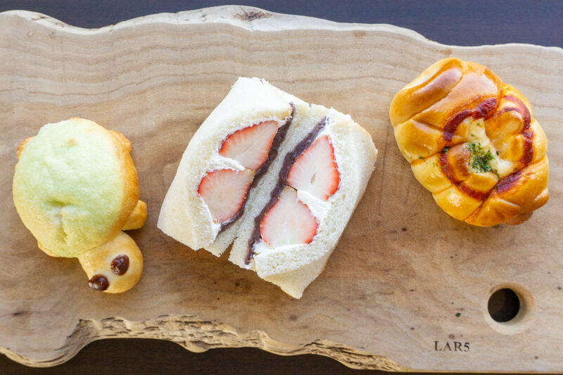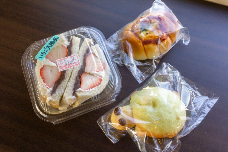 買ってきたのは左からフルーツサンド(いちご大福風)、フランクフルト、かめさんパン。