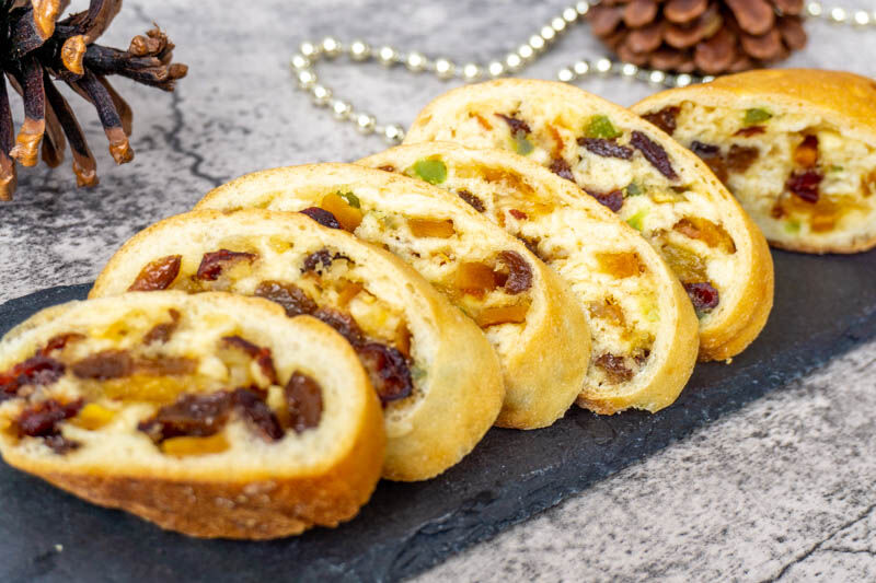 中にはレーズン・パイン・キウイ・マンゴーなどのドライフルーツが入っています。薄くスライスするのがおすすめなんだそう。