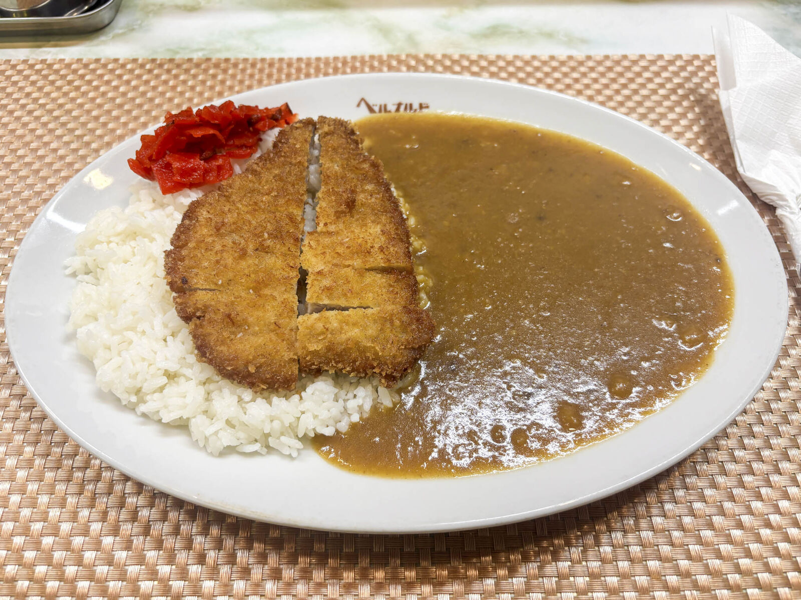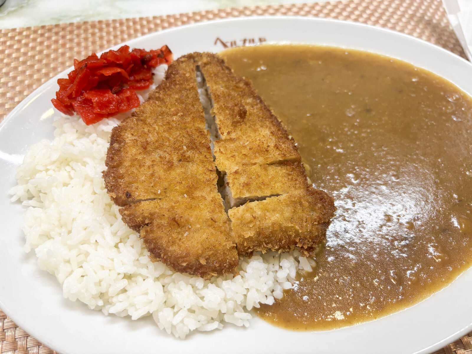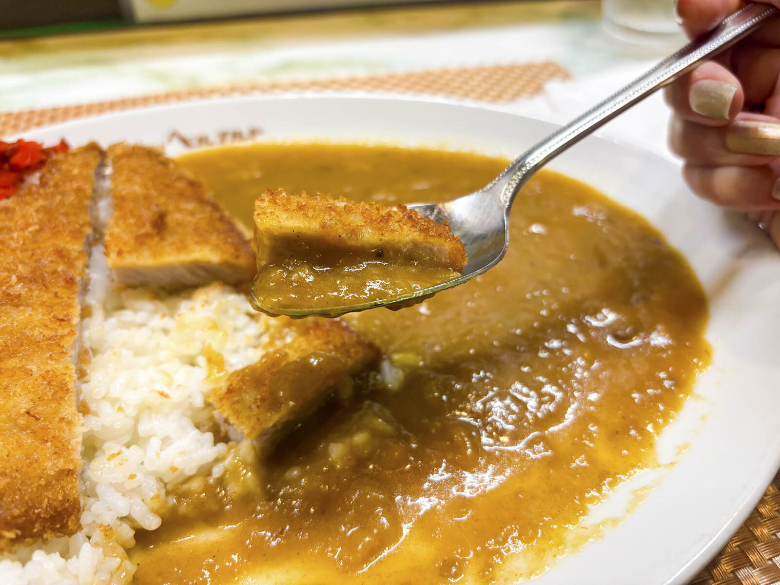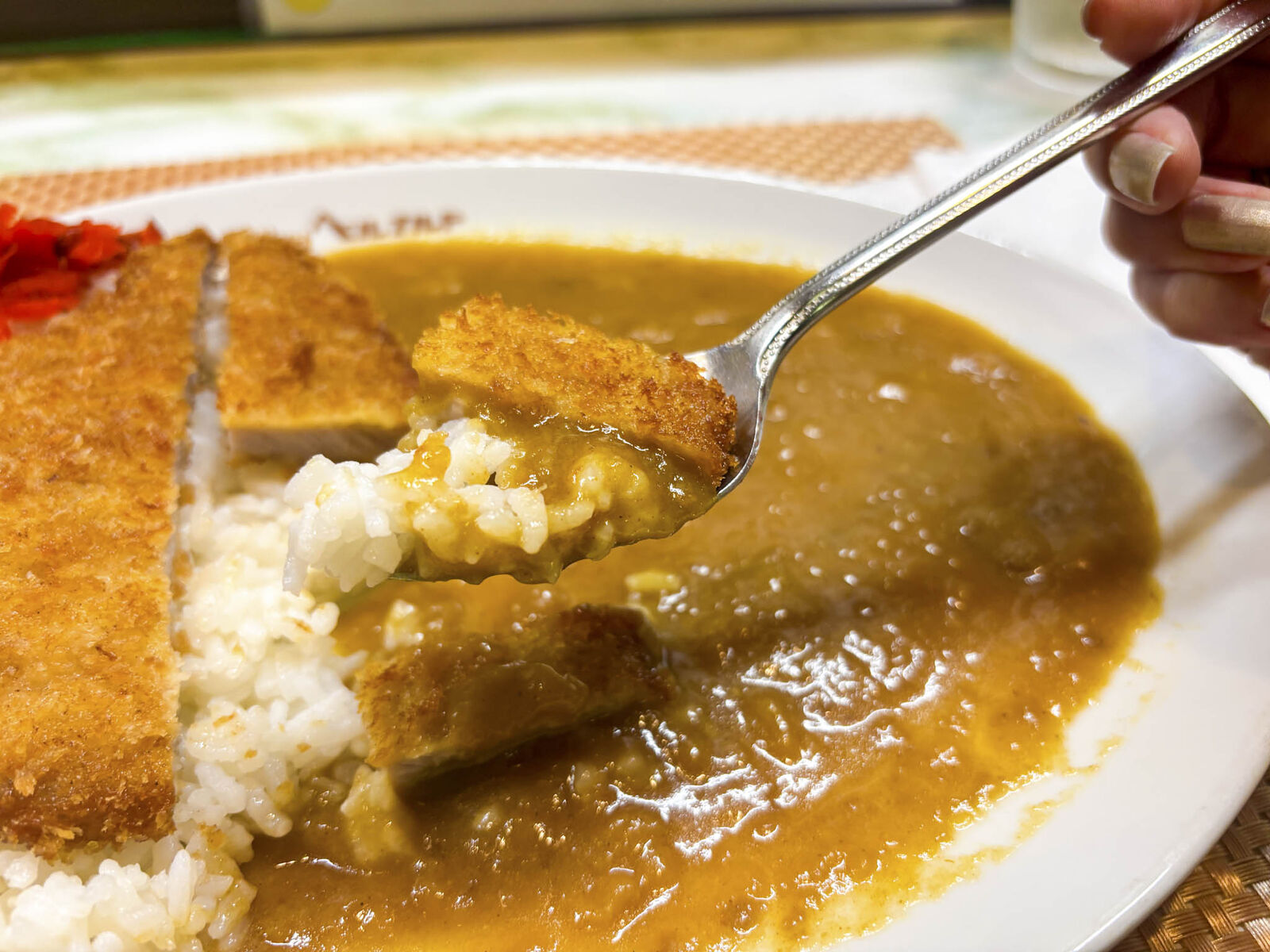カツはアツアツのサックサク!揚げたてです。この絶妙な厚さが、ルーとライスとベストマッチング~!スプーン一つでいただけるカツの切り方も、非常に有難いし優しさを感じます。