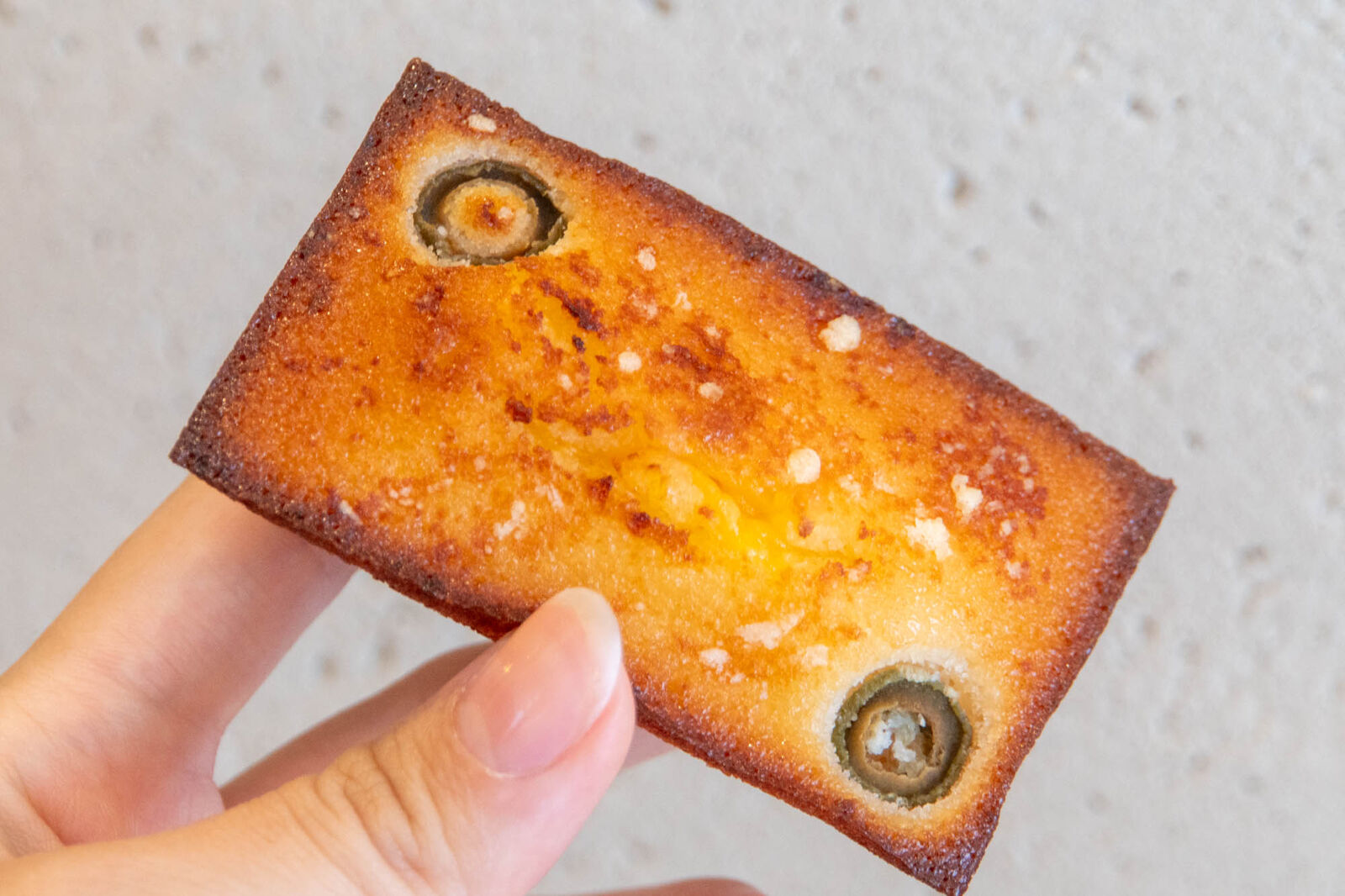 オリーブの実の食感と独特の風味にチーズのしょっぱさが、バターたっぷりの甘いフィナンシェと絶妙なハーモニー。