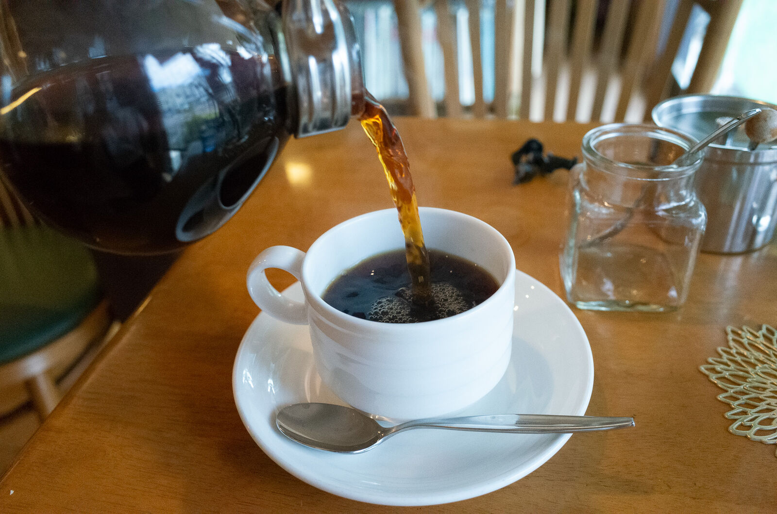 抽出が終わったコーヒーは客席でカップに注がれます。