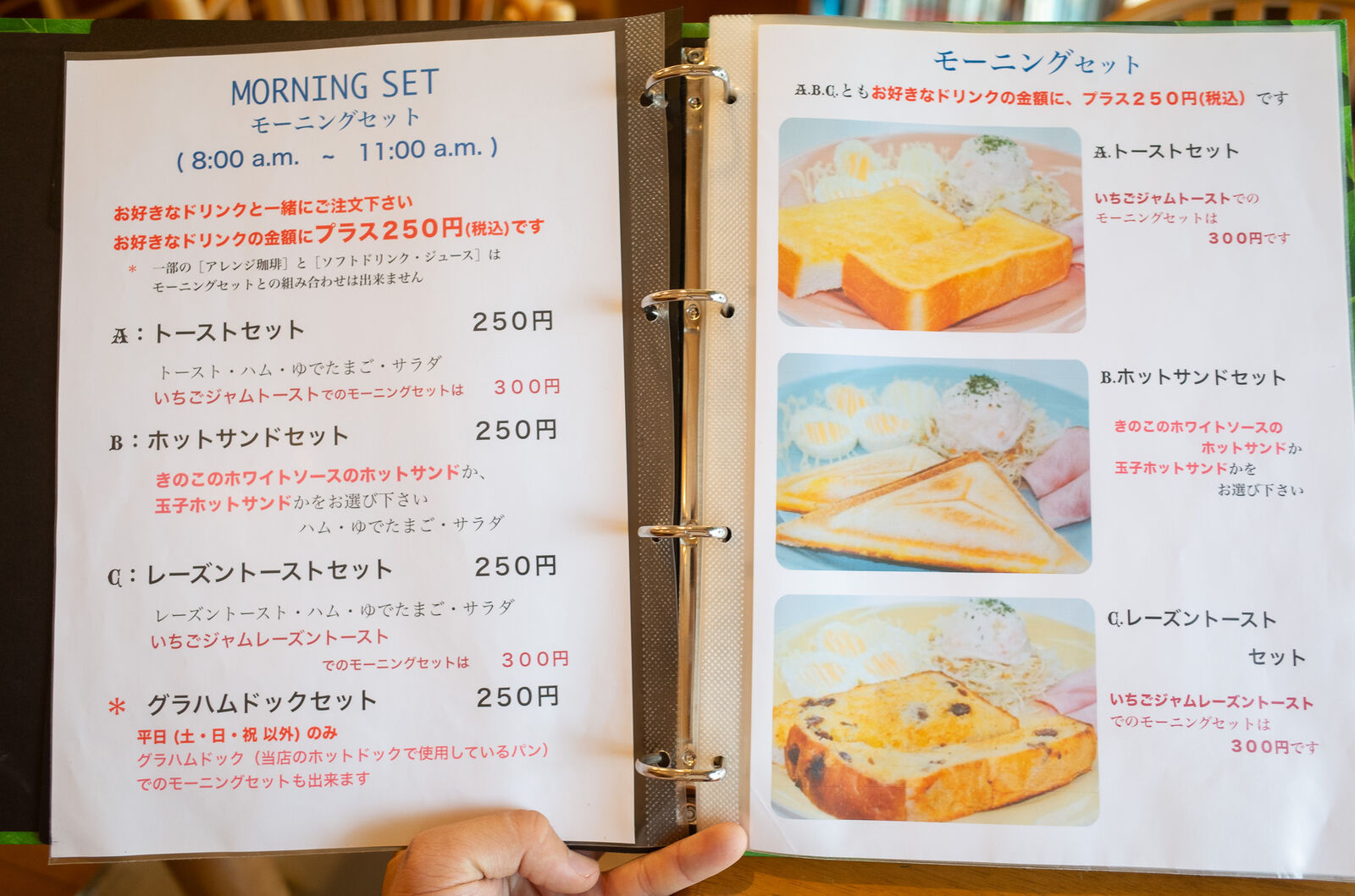 8時から11時はモーニングも実施しており、ドリンクに+250円でトーストなどがついてくるとってもお得な内容。