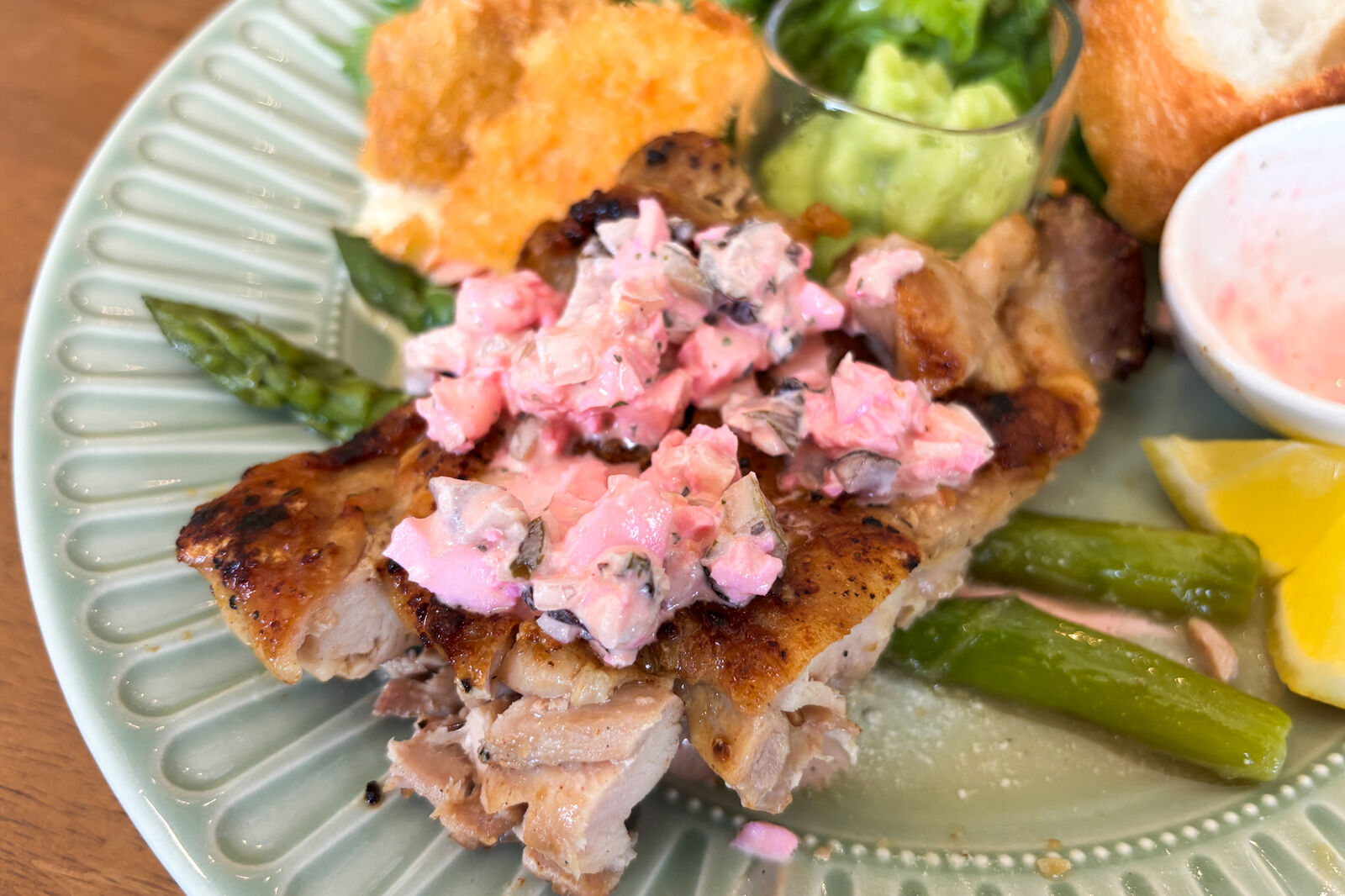 このタルタルはしば漬けを使ってピンク色にしているんだとか。チキンはパリパリジューシーでしば漬けとレモンの酸味が効いていて、とっても美味しかったです!!