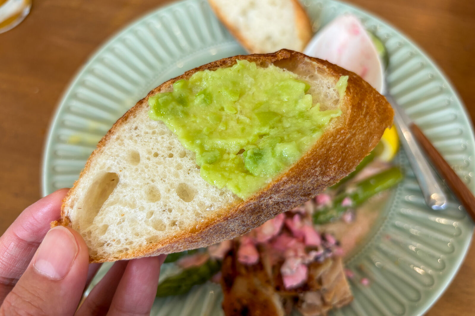 バケットはそら豆のペーストを塗っていただきま〜す!そら豆の甘さとほのかな苦味がバケットとよく合います。優しいお味!