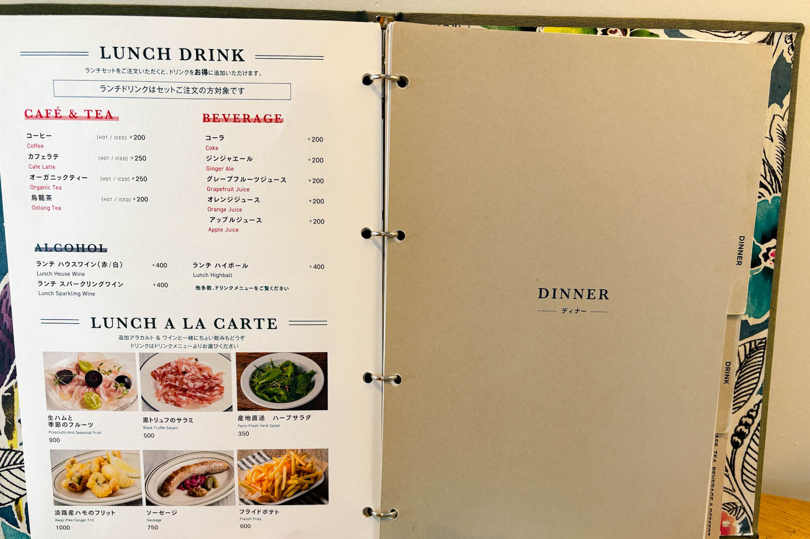 ドリンクとアラカルトメニューはこちら。