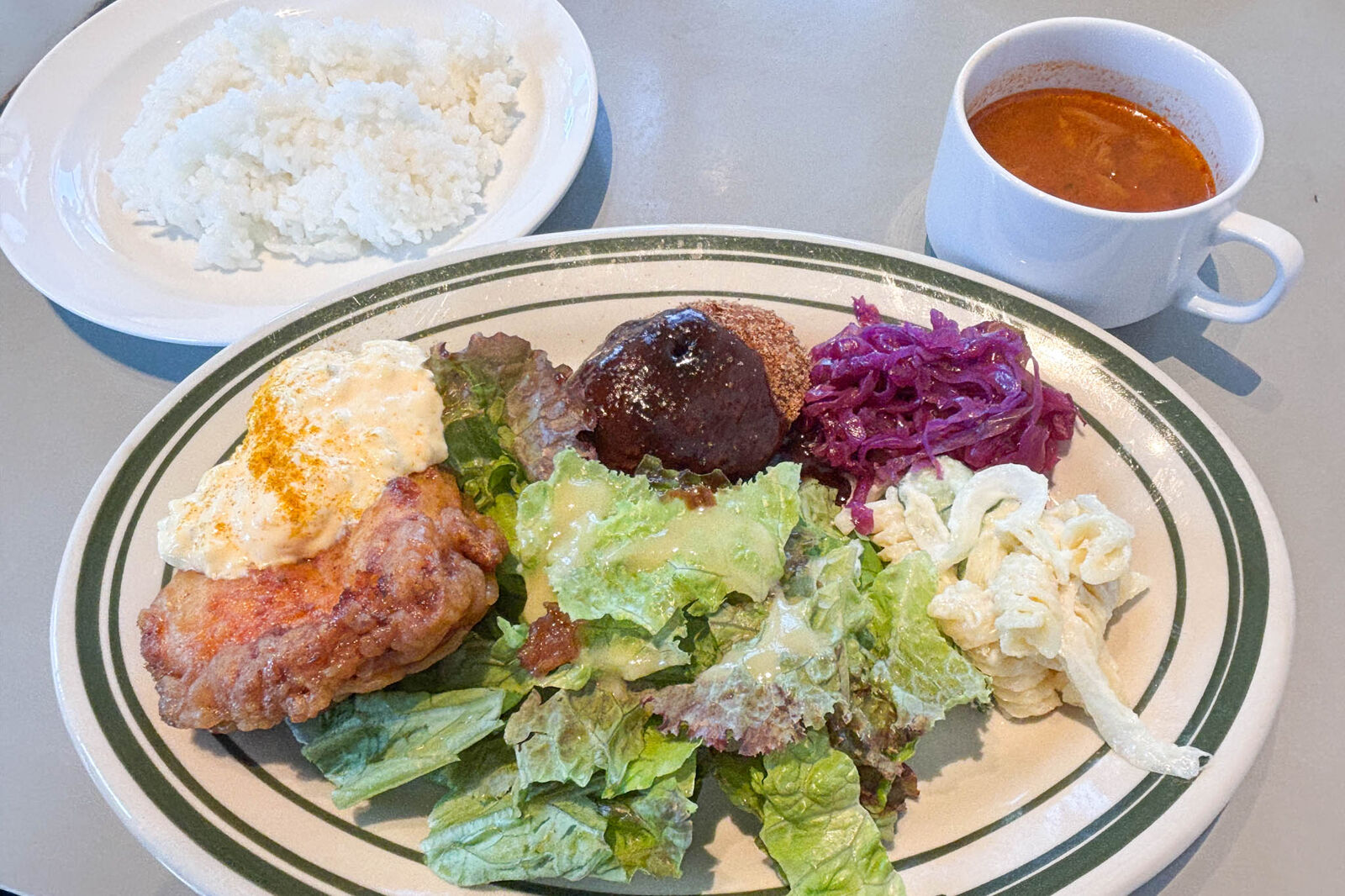 メイン2品に副菜、サラダ、スープ、ライスが付いてこのボリューム!彩りも良くて食欲をそそる〜!