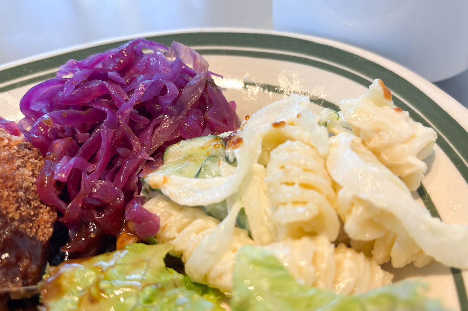 付け合わせはマカロニサラダと紫キャベツのラペ。