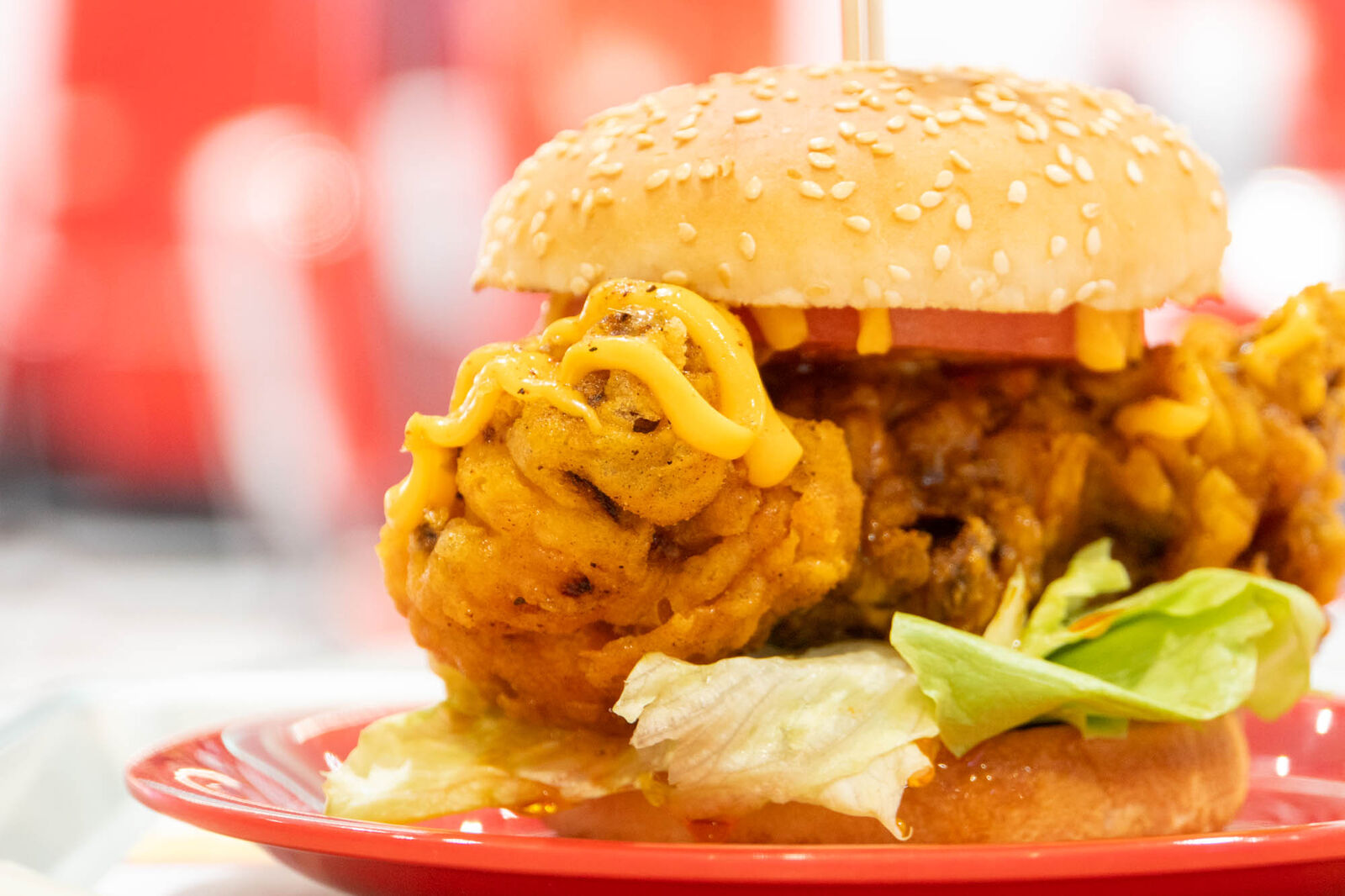 チキンの衣がザクザク&スパイシーな味付けで美味しい!そこに特製マヨソースの旨味が加わってボリューミーで食べごたえのあるバーガーに。