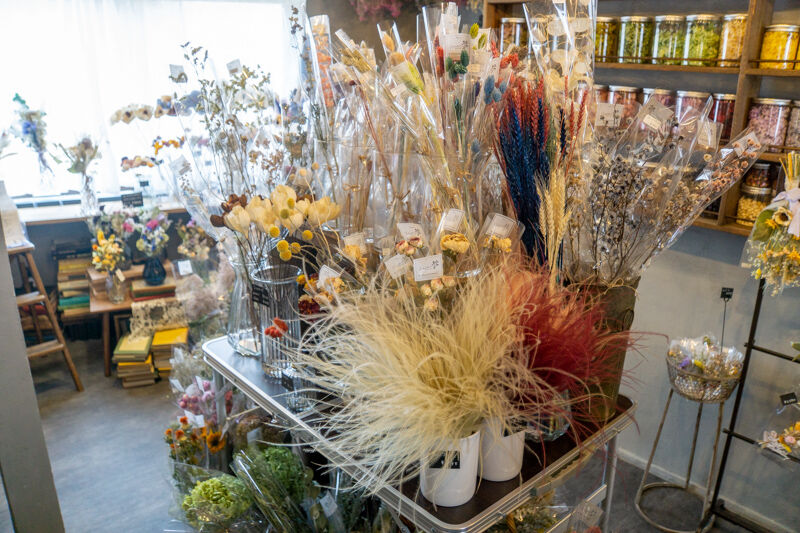 flower cafe Flat+の2階にはドライフラワーなど、たくさんのお花雑貨があります。