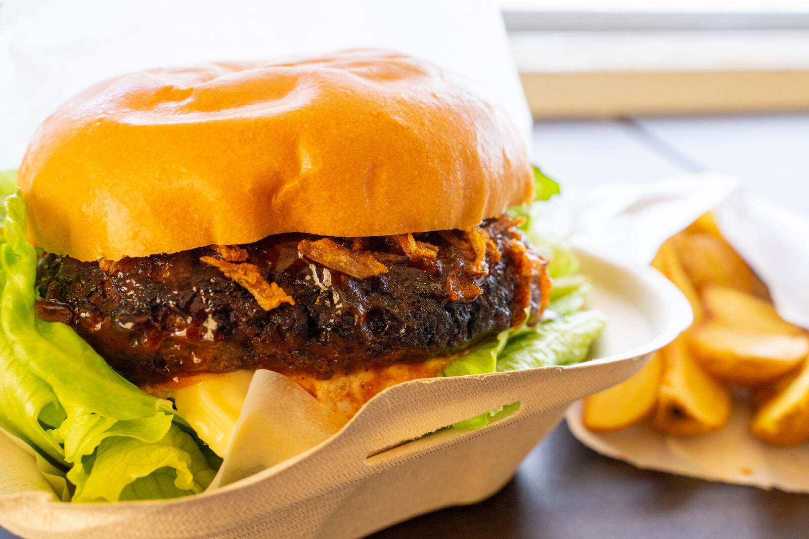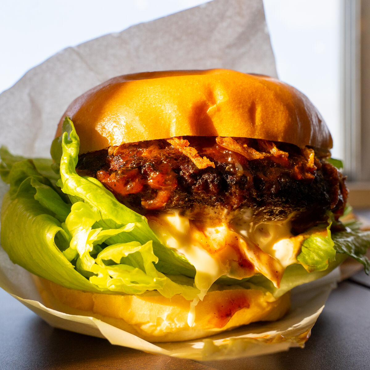 噛みごたえあるバンズに、肉肉しくて甘辛いハンバーグ!オーロラっぽいソースにフライドオニオンもあって、ただただパーフェクト。