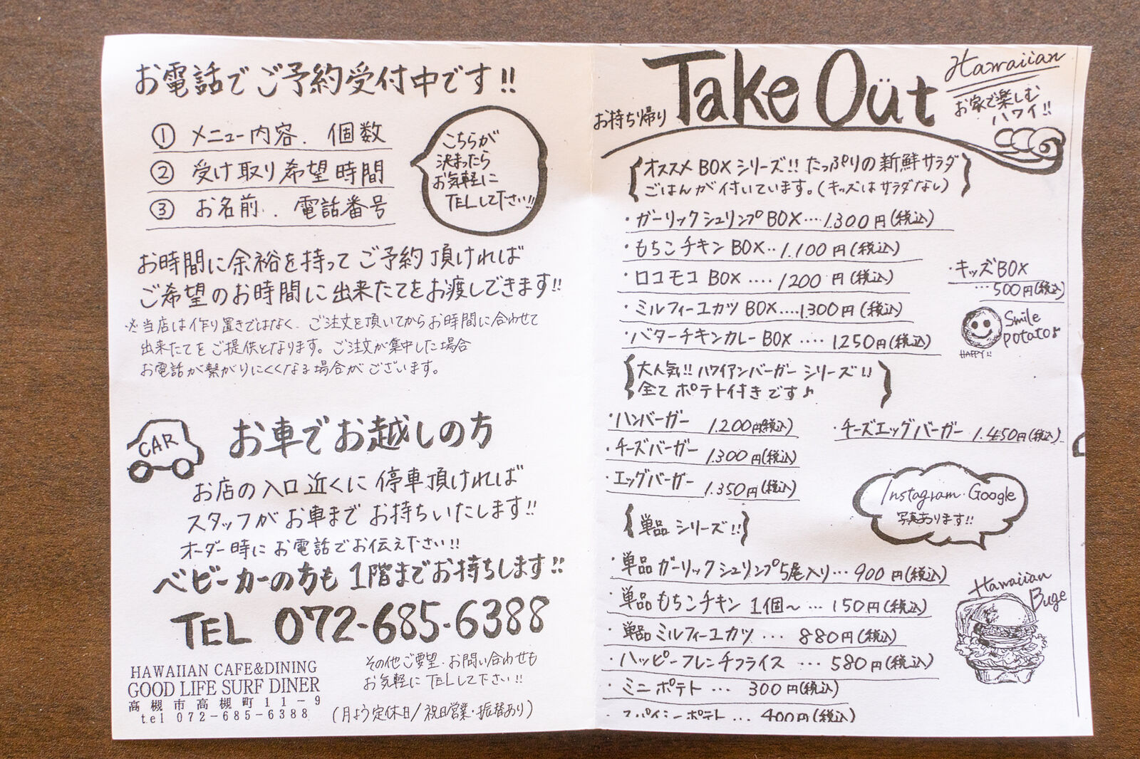 紙バージョンのテイクアウトメニュー。