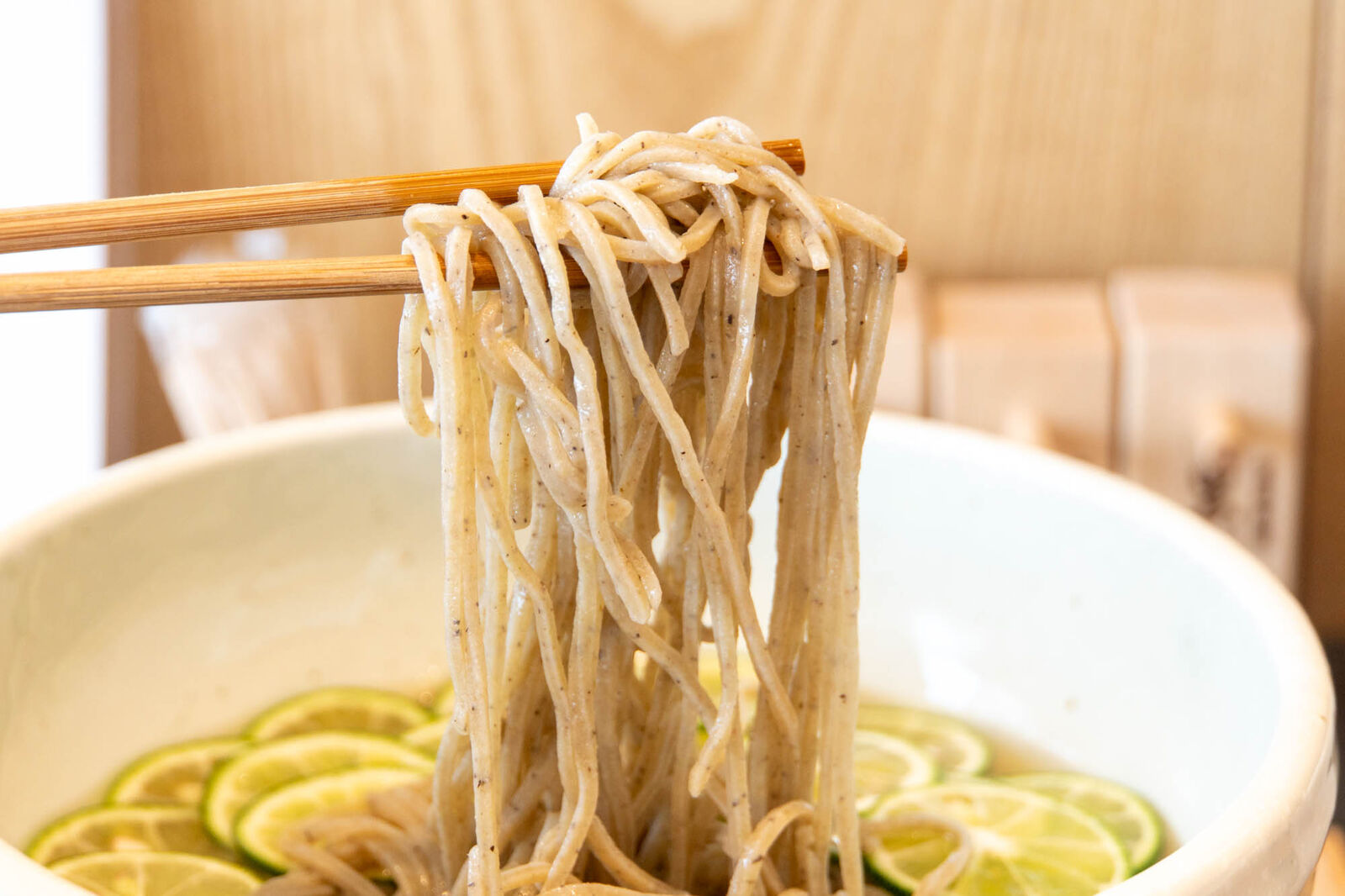 口に入れるとそば粉特有のざらりとした舌触りを感じ、少しもっちりとした食感。