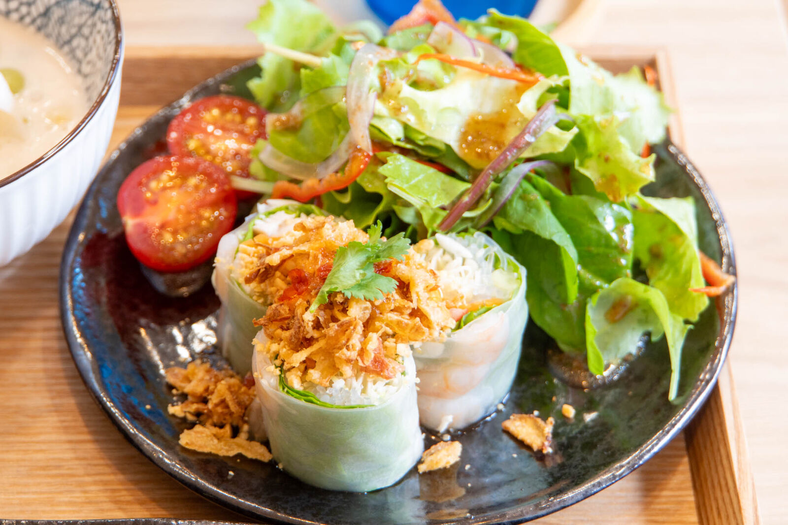 まずはサラダ。サラダだけじゃなく生春巻きも3つあります。