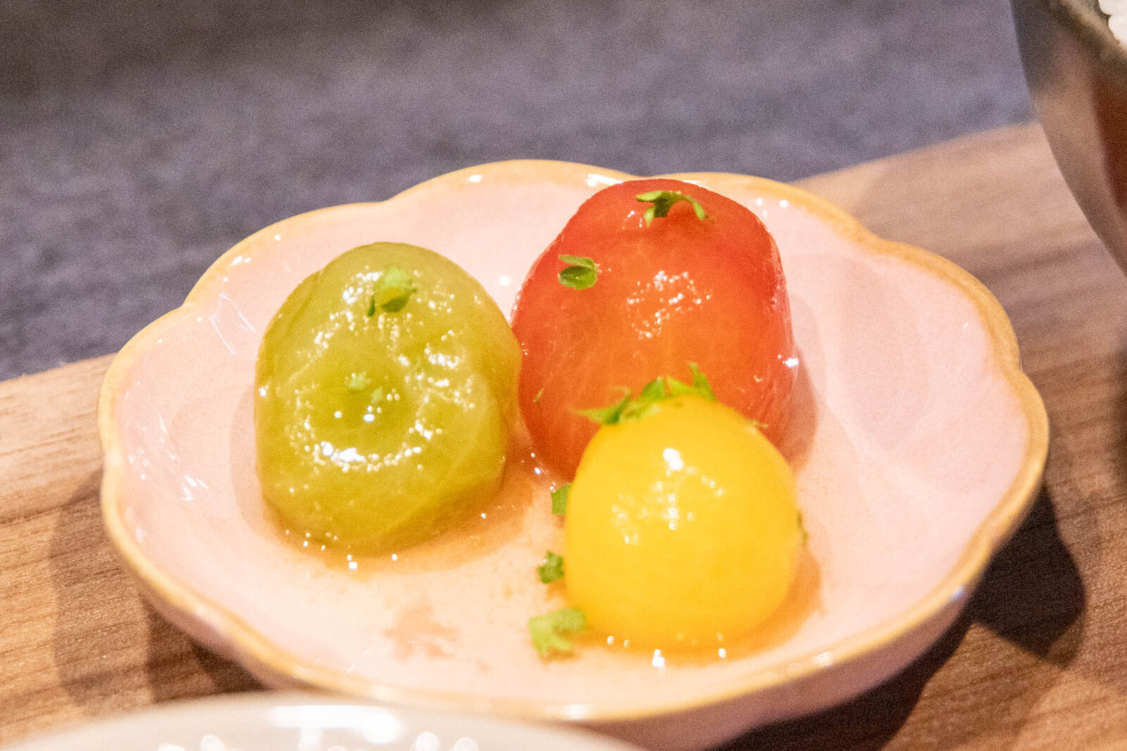 色とりどりのミニトマトがキラキラに光っています。この日の料理で一番手間がかかってる一品だそうで、ひとつひとつ丁寧に皮を向いているとのこと。