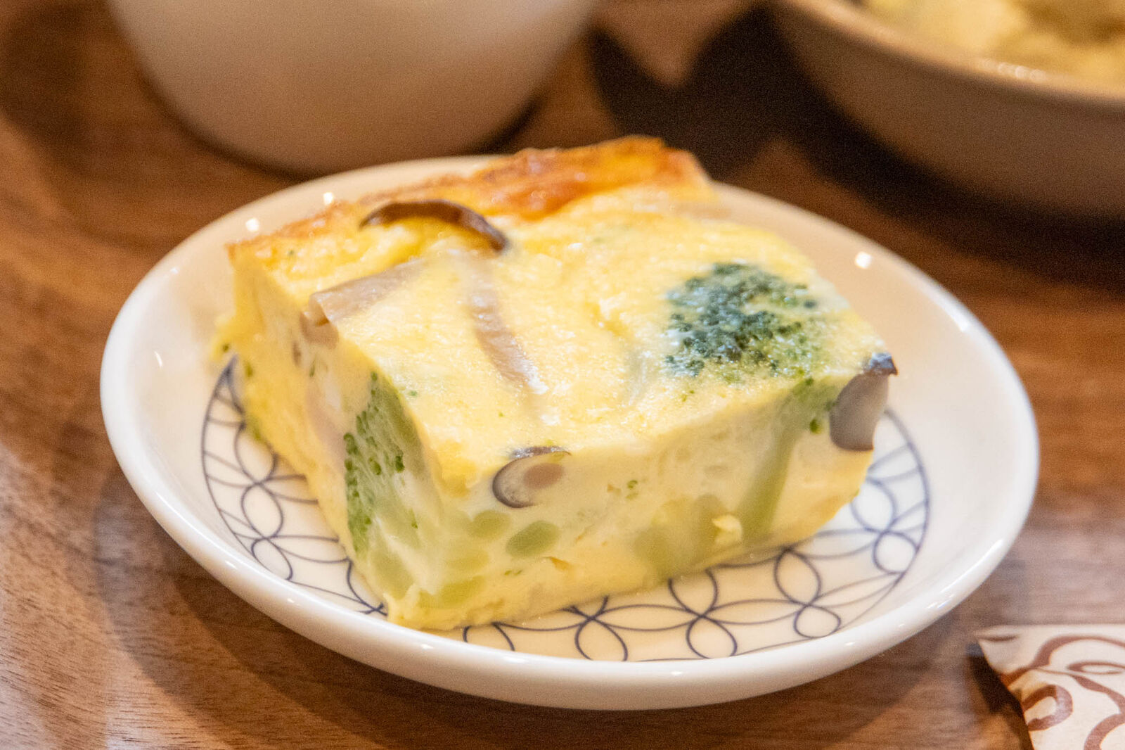 きのことブロッコリーなどがゴロゴロと入っていて、とっても分厚くて食べごたえがあります。優しいお味なのも◎