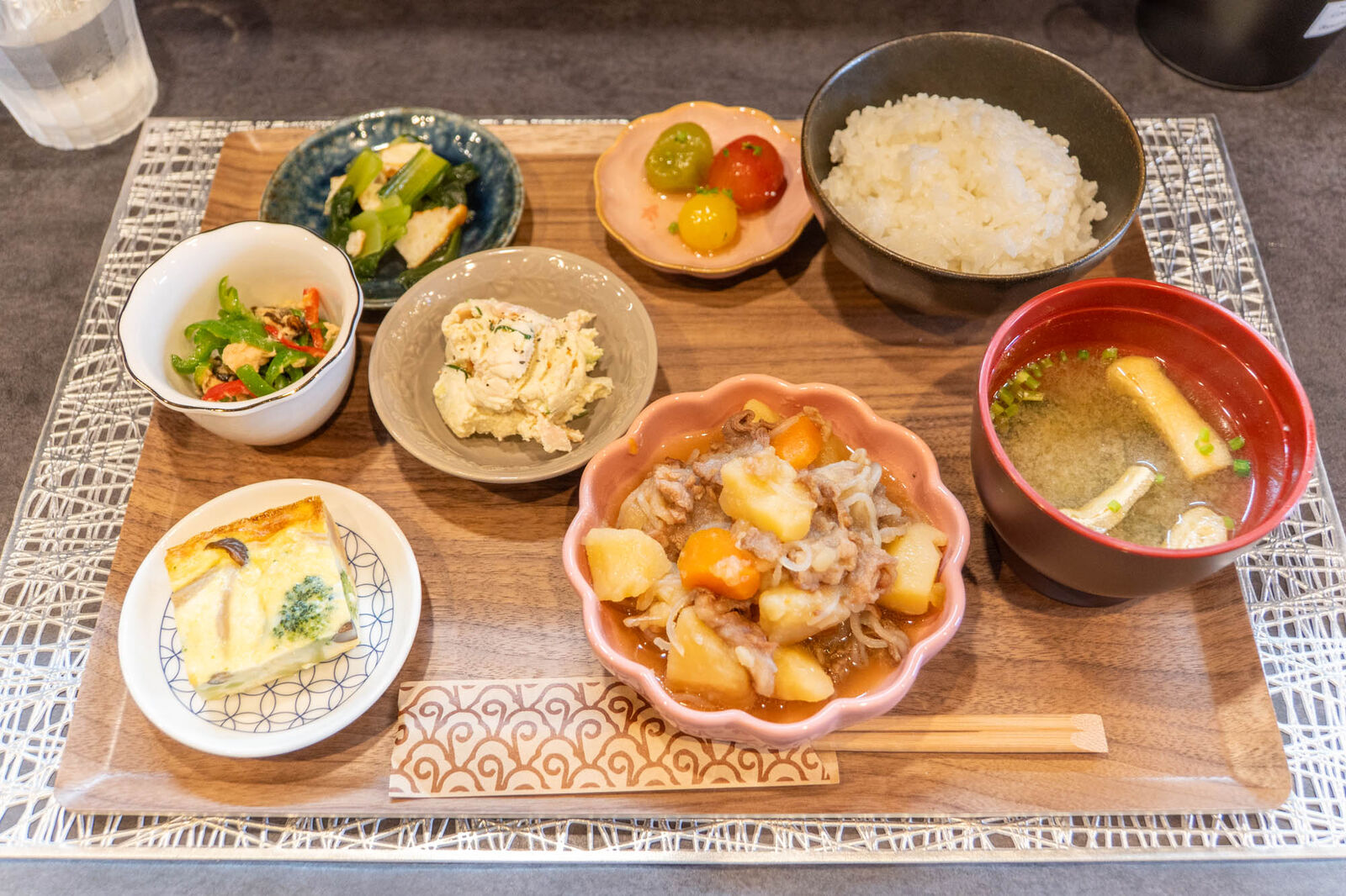 メインの肉じゃがプラス小鉢が5品もセットに。めっちゃ豪華。