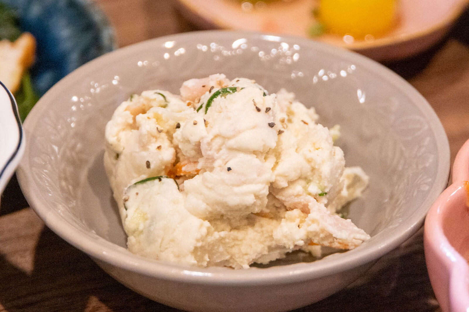 ポテトサラダと思って食べるとなんだか大豆の味がしたので聞いてみると、じゃがいもの代わりにおからを使用しているんだとか。
