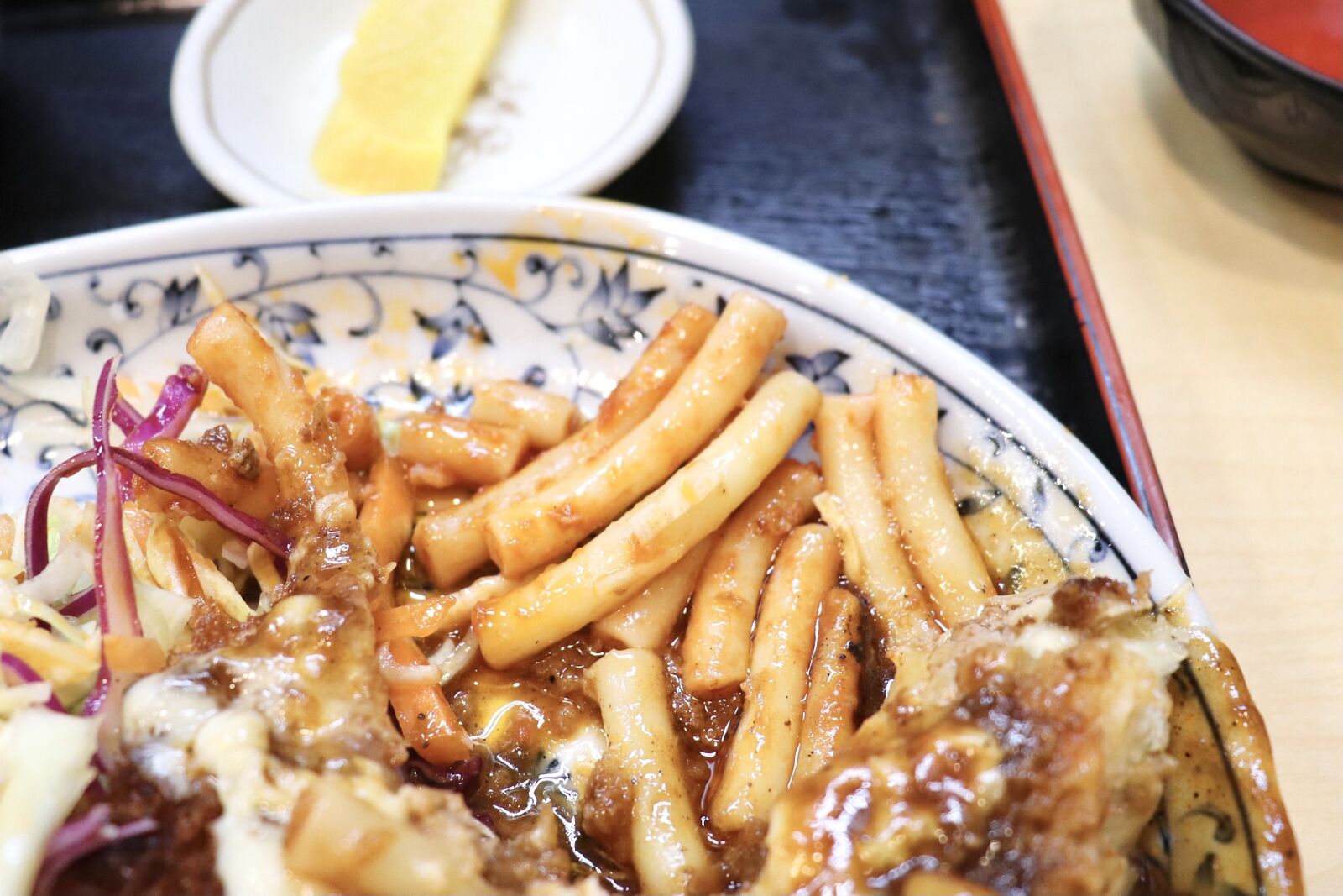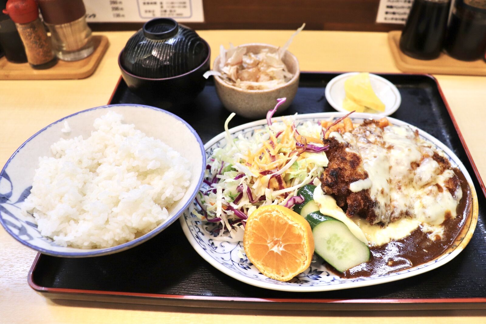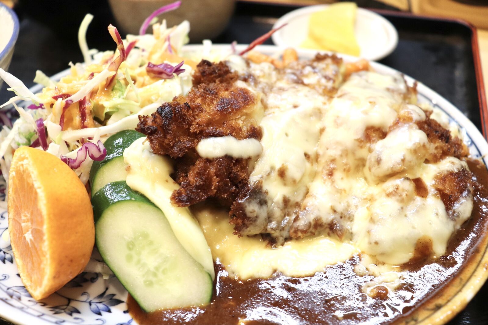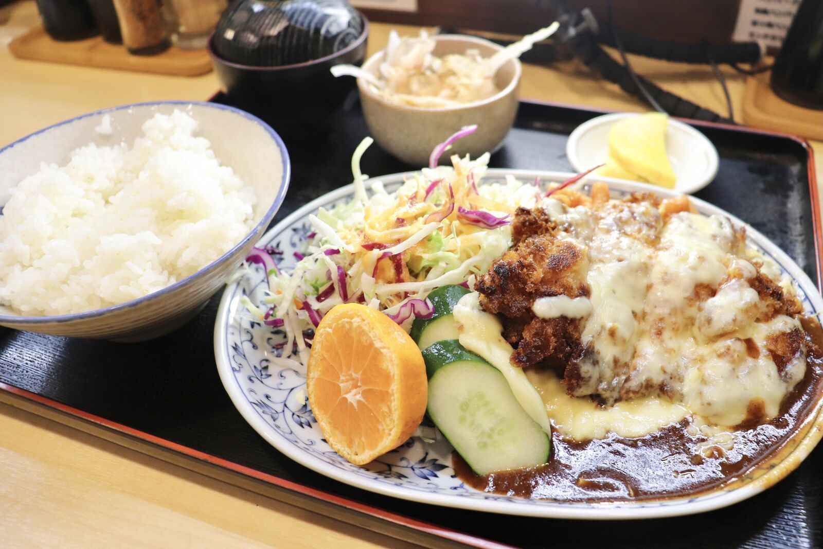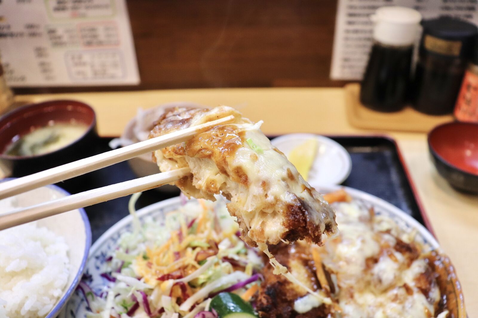 チキンかつは肉厚で柔らかく、濃厚でコクのあるデミグラスソースとたっぷりのチーズがよく絡まっていてまさに絶品。食べるとすぐにあつあつのご飯をかきこみたくなります!