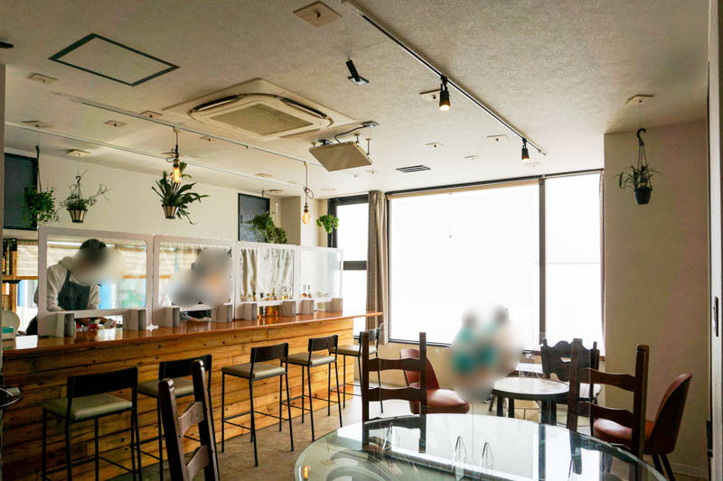窓際は大きな窓があって、自然光が入りおしゃれ。夜はバーとしてもオープンしていますよ〜。