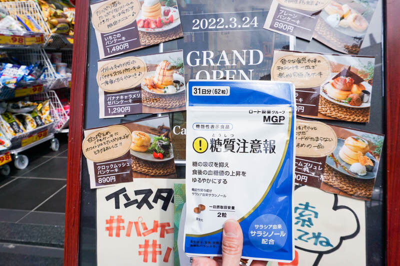 パンケーキということで、まずは糖質注意報をお店の前でパクリ!
