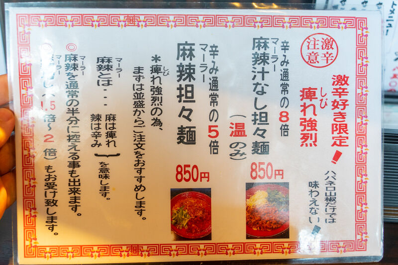 激辛好き限定!痺れ強烈!辛み通常の8倍!麻辣汁なし担々麺を注文することにしました。