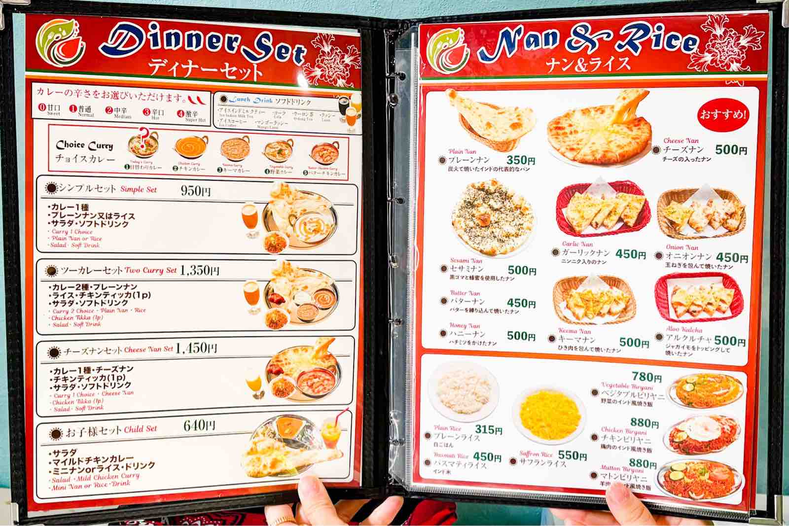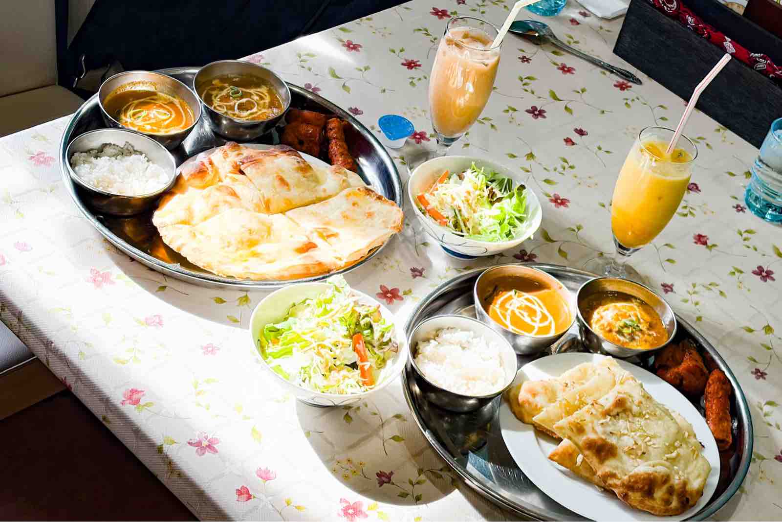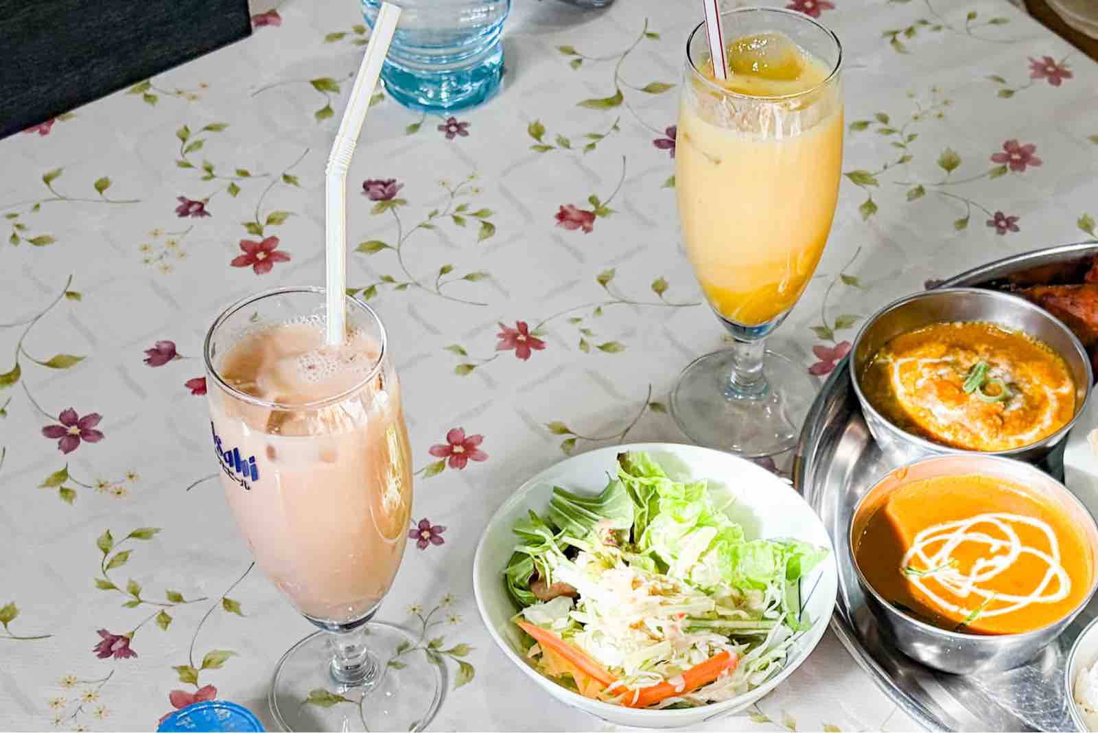 私アイミールは、チキンカレーと野菜カレーの2種で、どちらも中辛、ハニーナンにアイスインドミルクティー。(ちなみにこの日の日替わりカレーは野菜チキンカレーでした。)