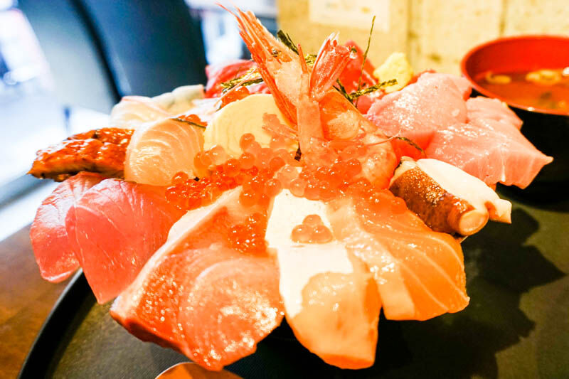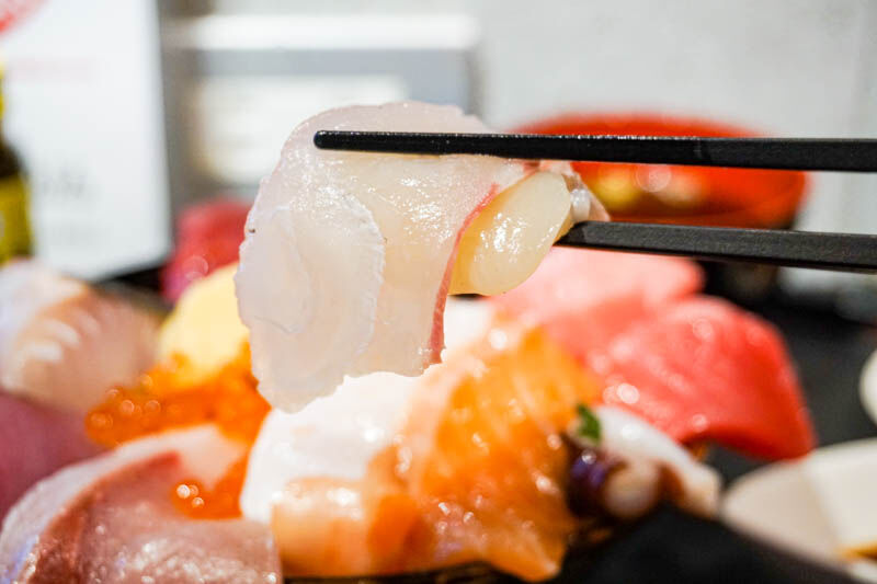 すごいボリューム…、ほら!はみ出していますよ。厚切りのネタたち!!もう器が見えません。