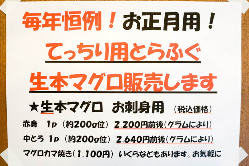 てっちり用とらふぐ、生本マグロ販売があるようです。お店のマスターはマグロの解体も出来るらしいですよ〜。