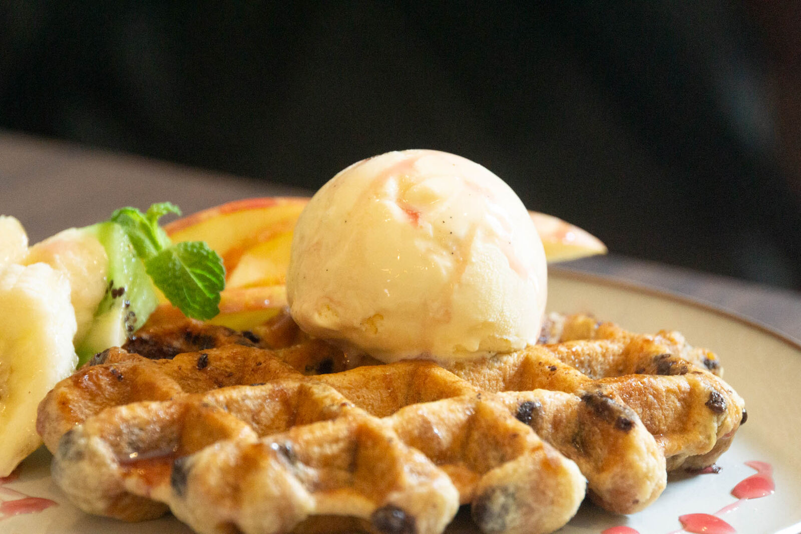 そこにフルーティーなレッドフルーツソースが合わさって相性は最高!ワッフルの中にチョコチップが所々入っているのも嬉しいポイント。