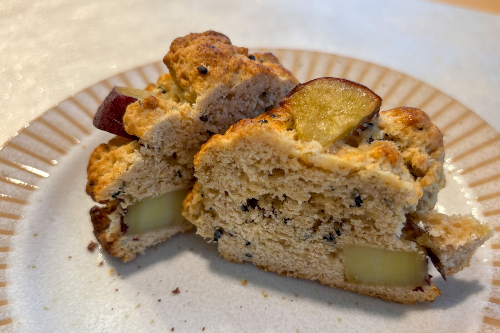 半分に割ってみると中にもさつまいもが。スコーンの外側のカリカリ食感と、お芋のやわらかい歯ごたえもいい!