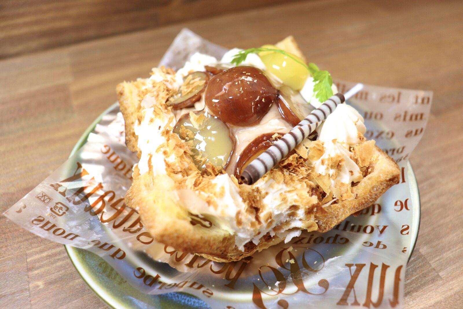 生地の上にはふんだんに栗が乗っています。中にはマロンクリーム、生クリーム、カスタードと3種類のクリームが入ってあり、こちらも生地の上とは違う、くちどけの良いクリームが入っていました。