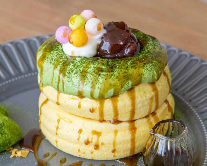 極厚のパンケーキ2段の上にはたっぷり甘い抹茶クリームがあり、さらにあんことサクサクのお菓子がトッピングされていました。このぽてっとした丸いフォルムも可愛い…!